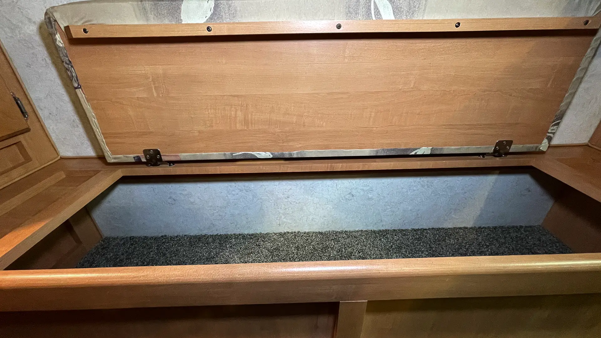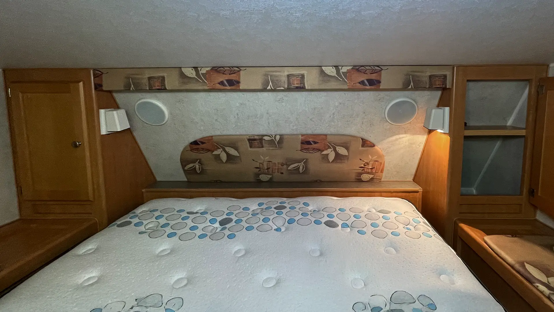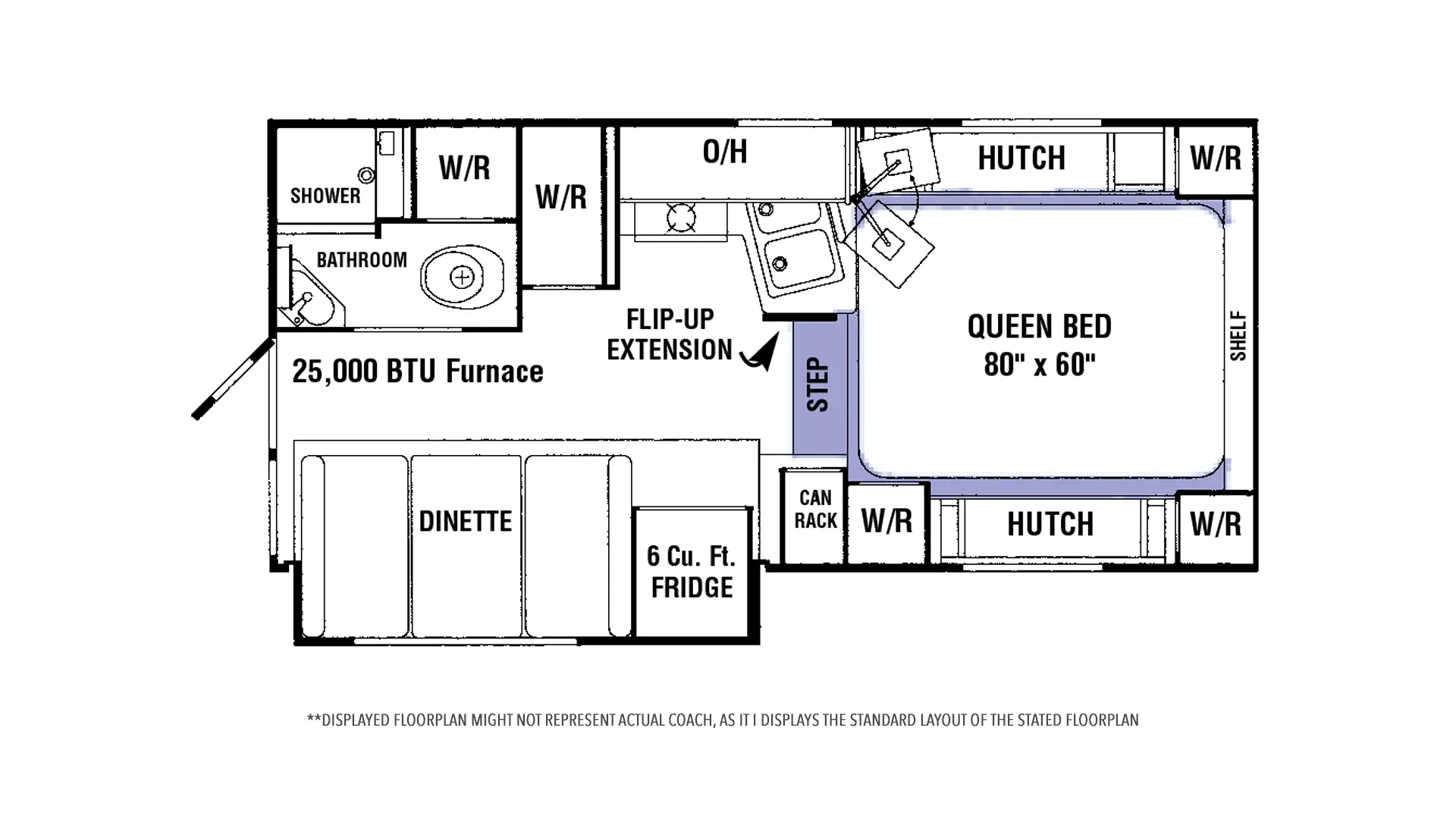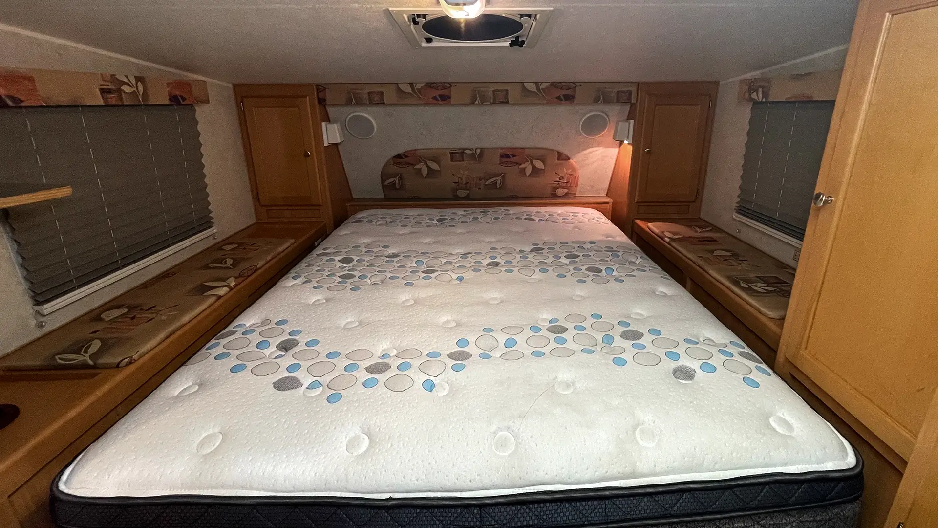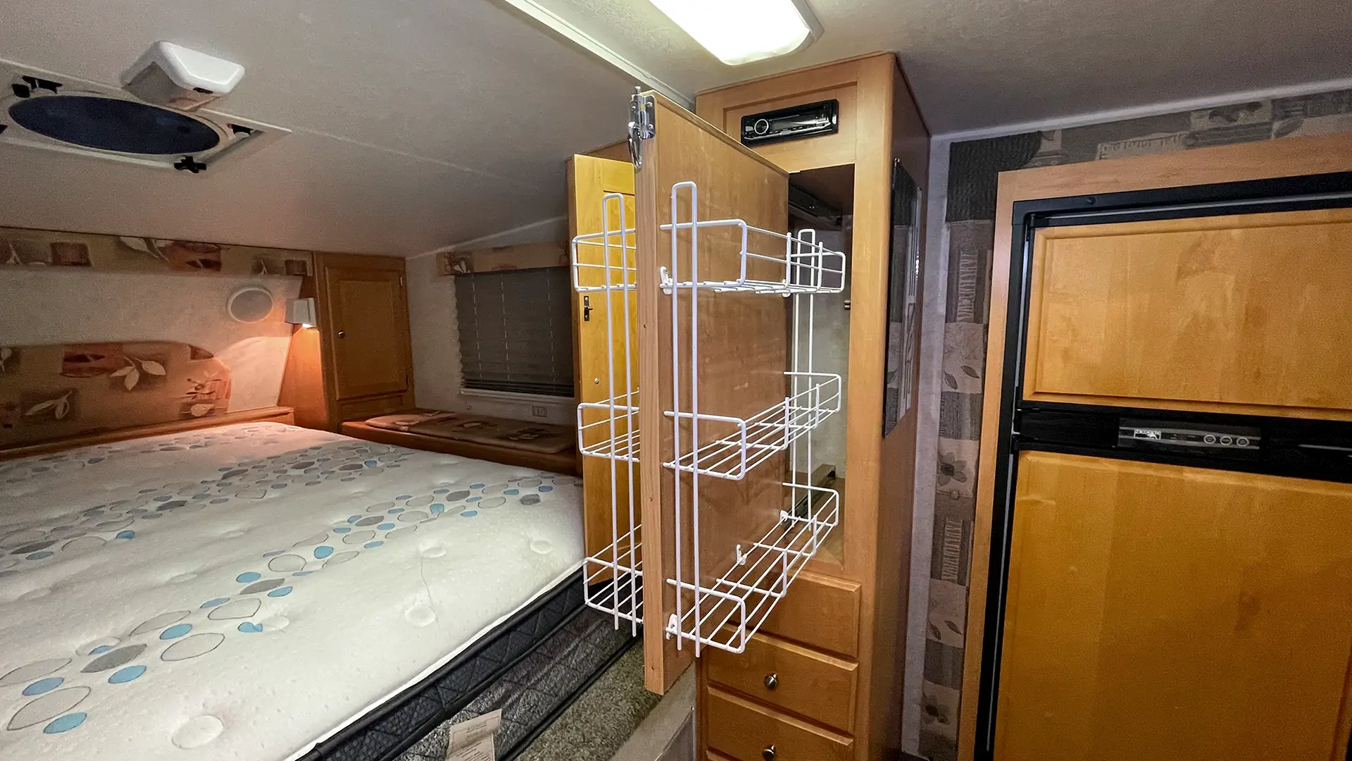 Bedroom Queen Bed; Side Bedroom Storage Hutches; Front Bedroom Storage Cabinets; Escape Window