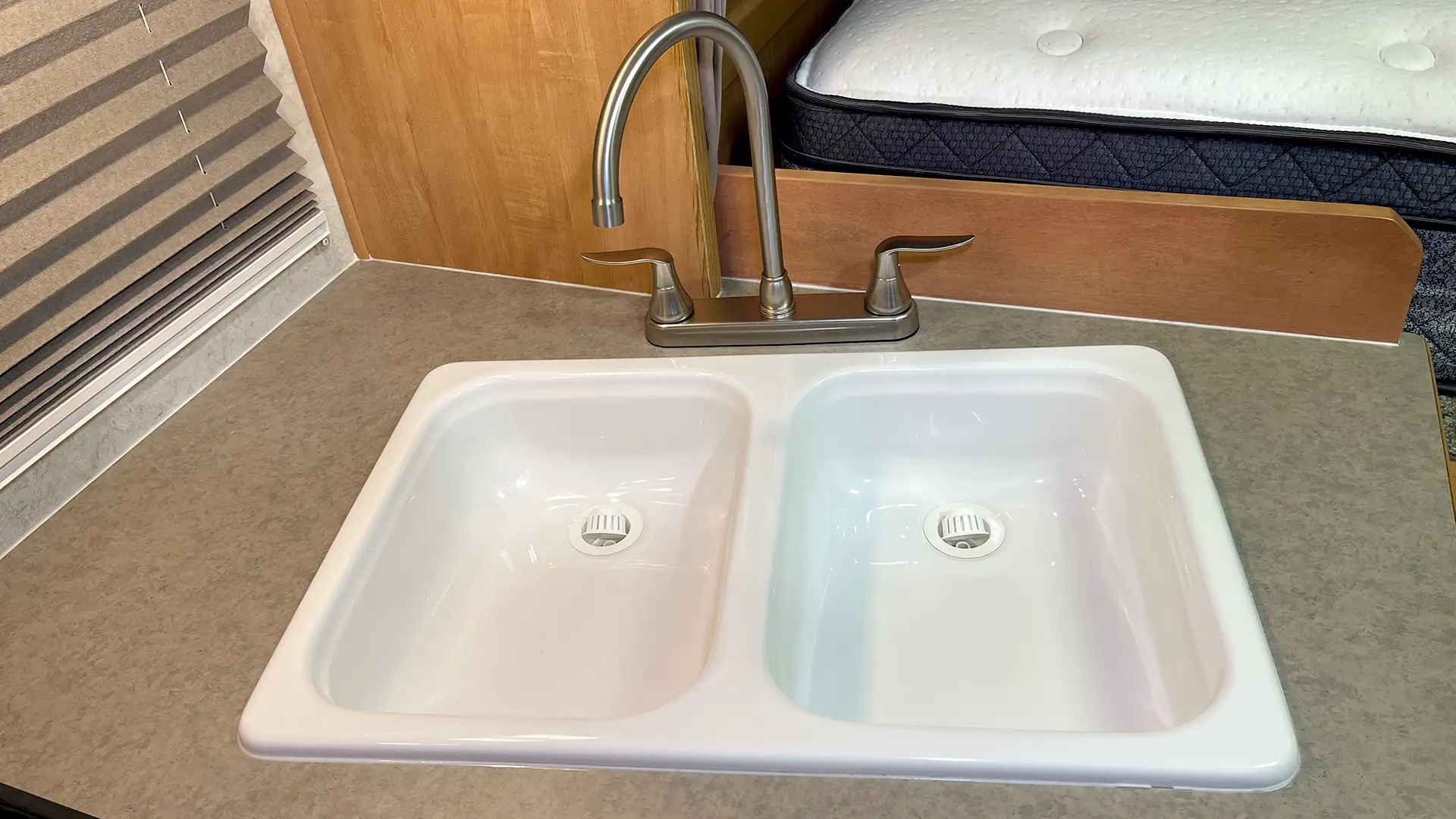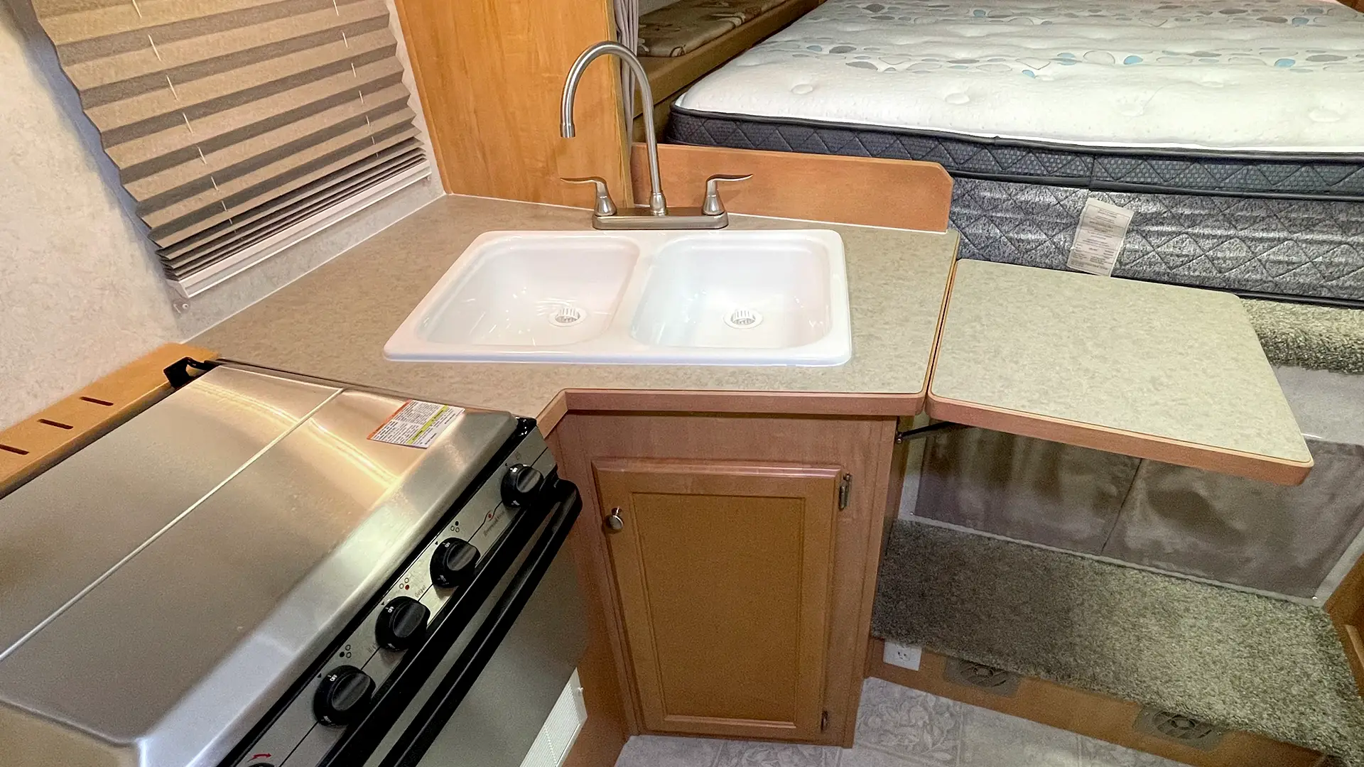 Kitchen Extras Slide-Out Pantry Closet; Flip-Up Countertop Extension; Fibreglass Acrylic Kitchen Sink w/Residential Faucet w/Spray; Cutting Board Sink Covers