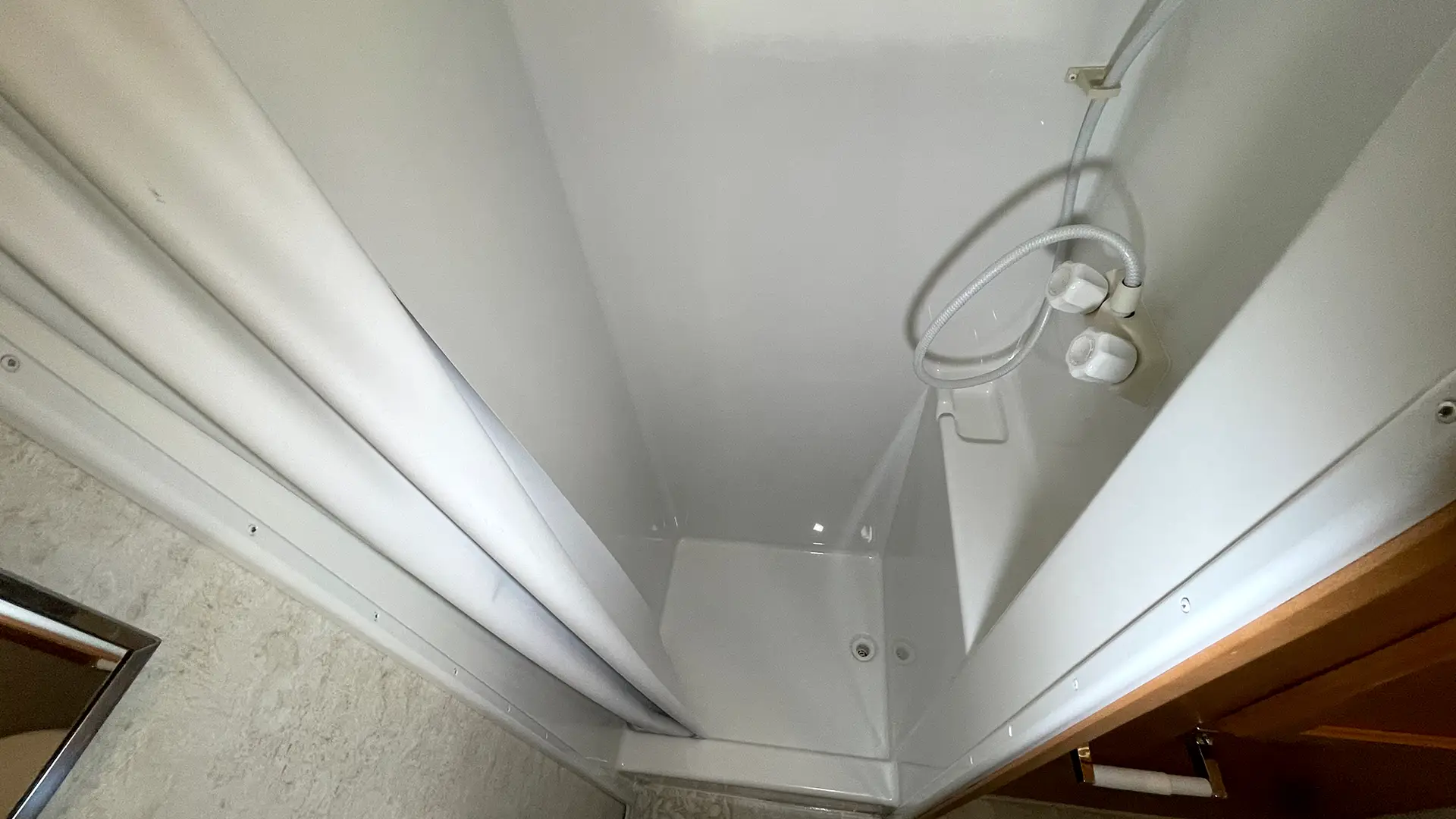 Bathroom Foot-Flush Toilet; Mirrored-Front Medicine Cabinet; Seamless Fibreglass Shower Enclosure