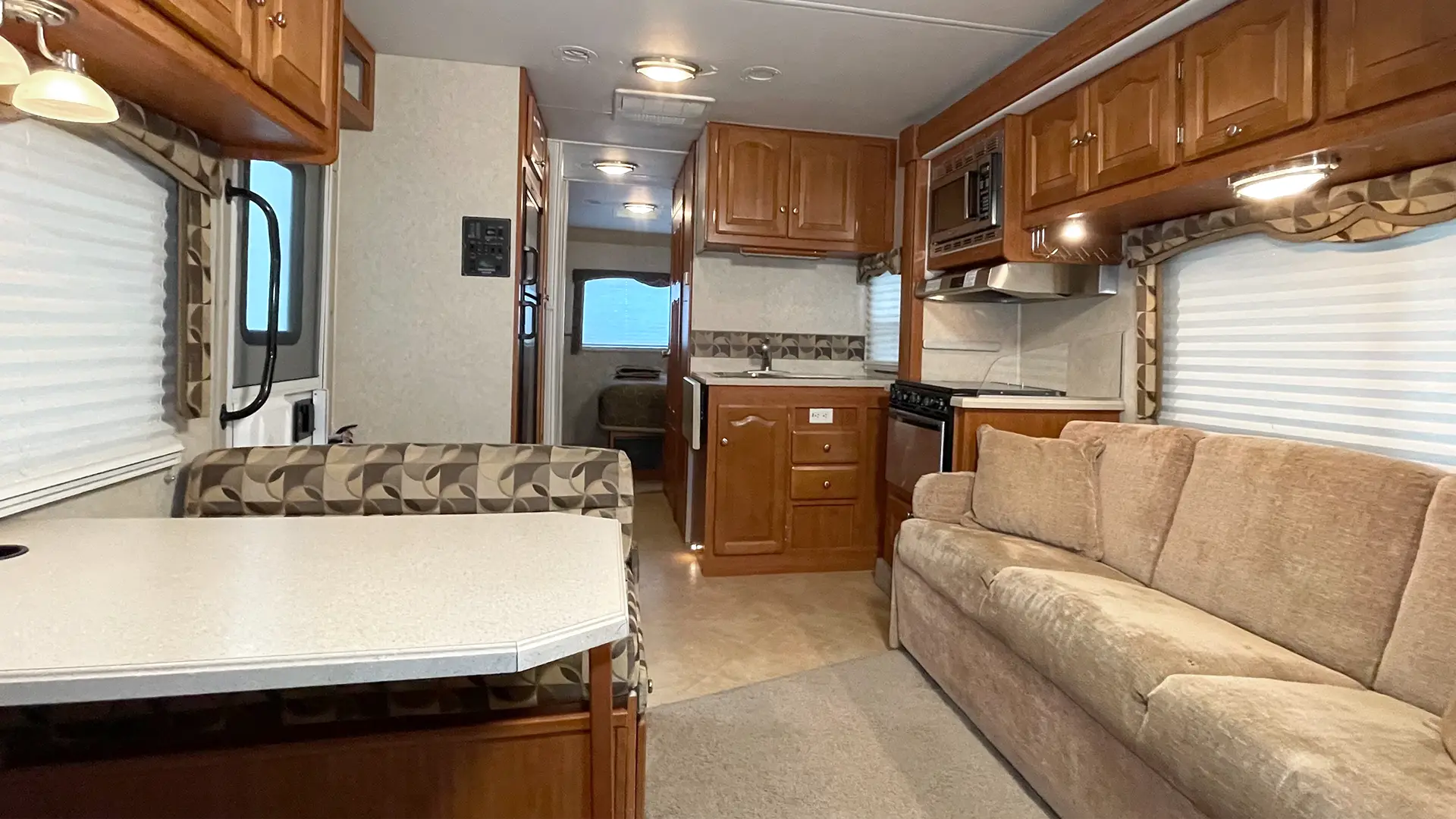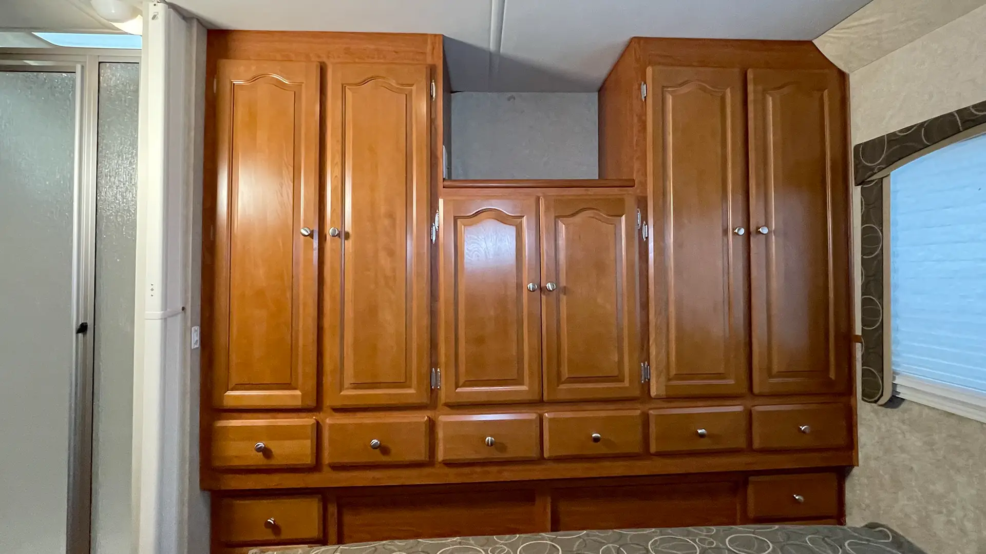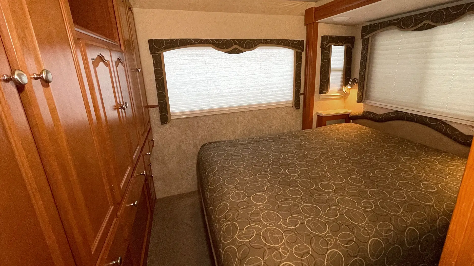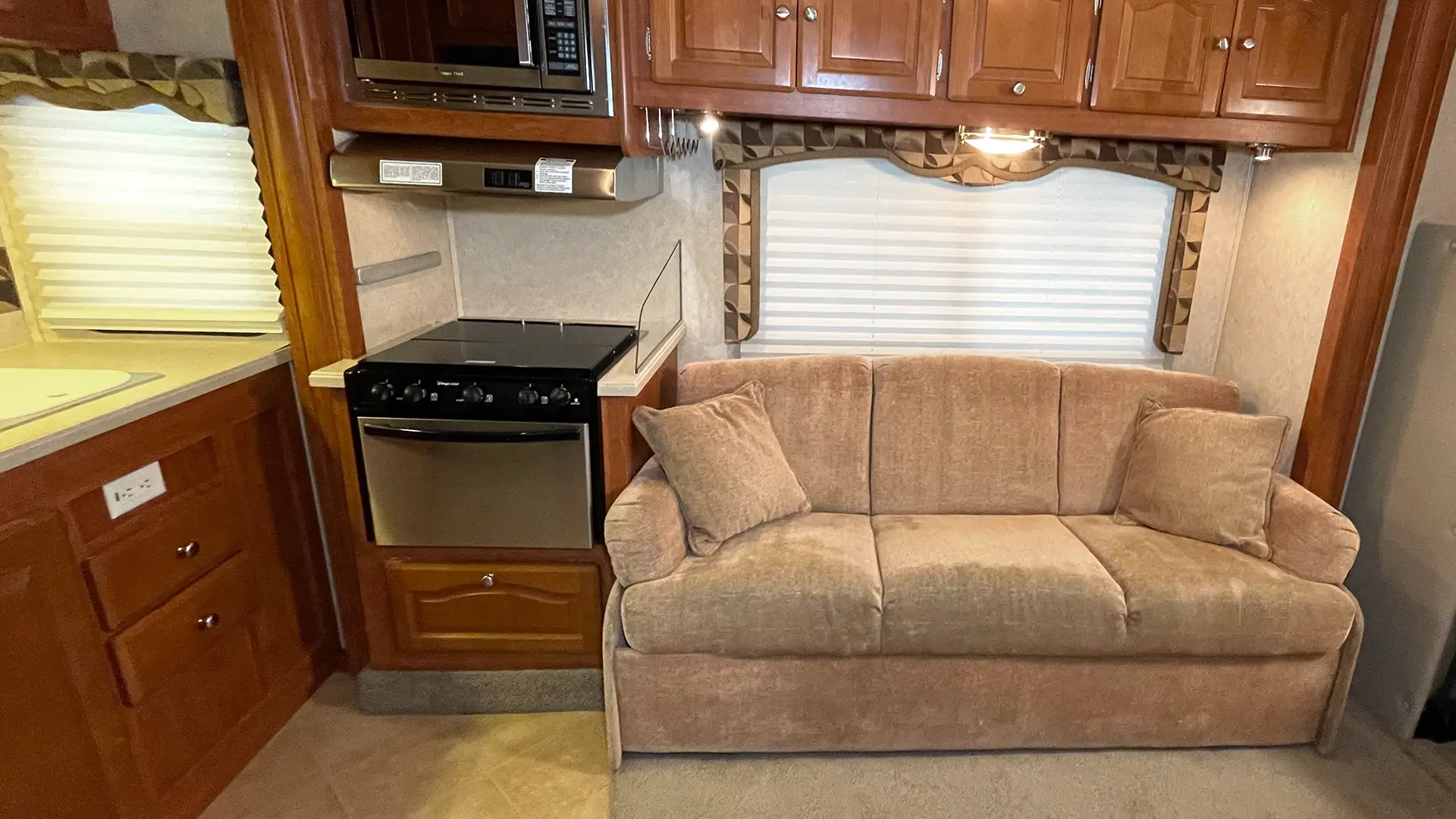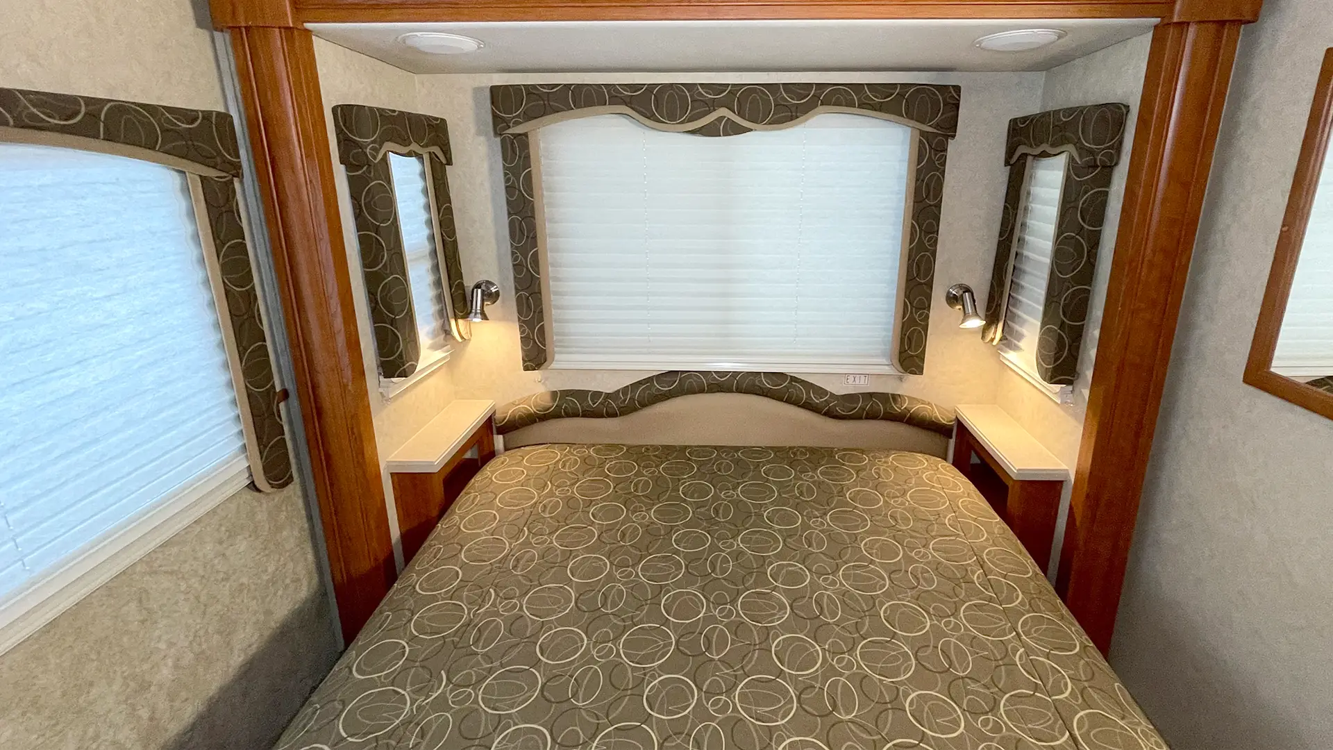 | Finishes | Solid Surface Edge Countertops; Cherry Wood Cabinetry; “Soft-Touch” Vinyl Padded Ceiling; Upgraded Glass Light Fixtures; Fantastic Roof Vent |