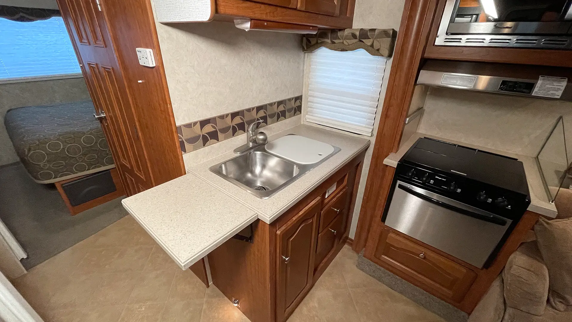 | Kitchen Extras | Flip-Up Countertop Extension; Range Hood w/Fan & Light; Split Kitchen Sink w/Single Level Faucet and Sink Cover; Pantry Space |