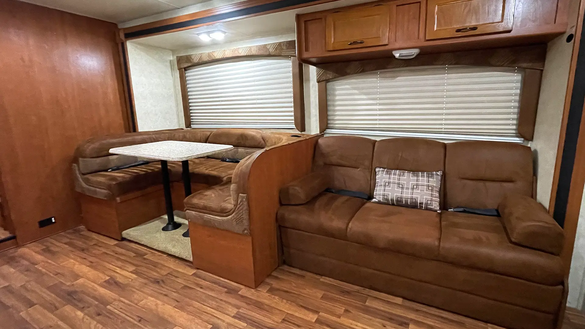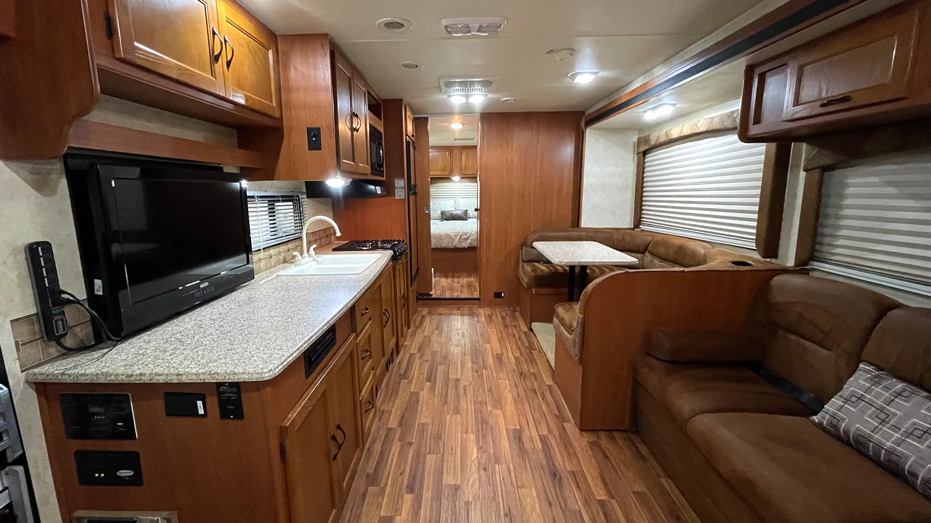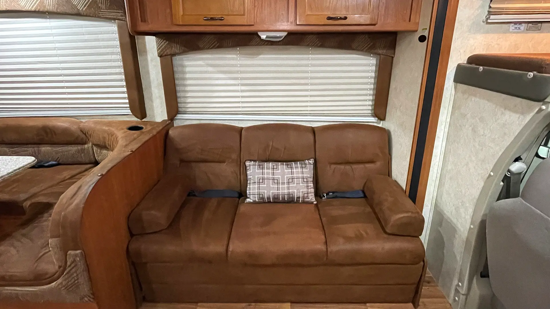 Step inside and you’re greeted by a warm, thoughtfully arranged interior that emphasizes relaxation and togetherness. The spacious living area, complete with a convertible sofa and dinette, creates a welcoming hub where family and friends can gather after a day of exploring. Entertainment is built in, with a 32” LCD TV and media inputs that let you enjoy movies or games on the road, while the residential-style queen bed ensures restful nights that rival the comfort of home.