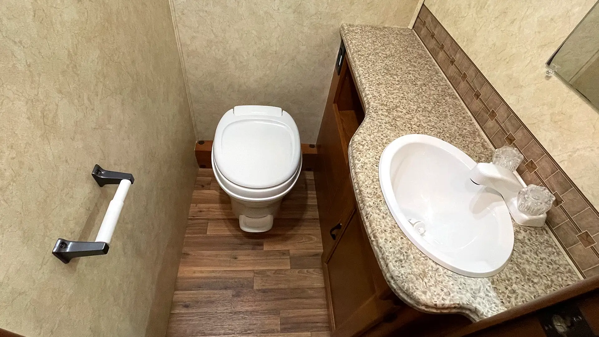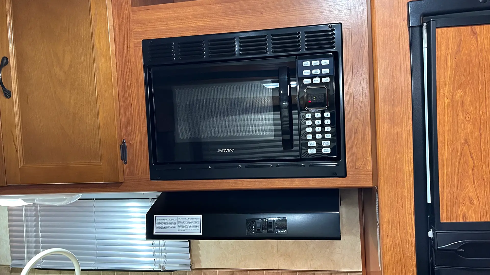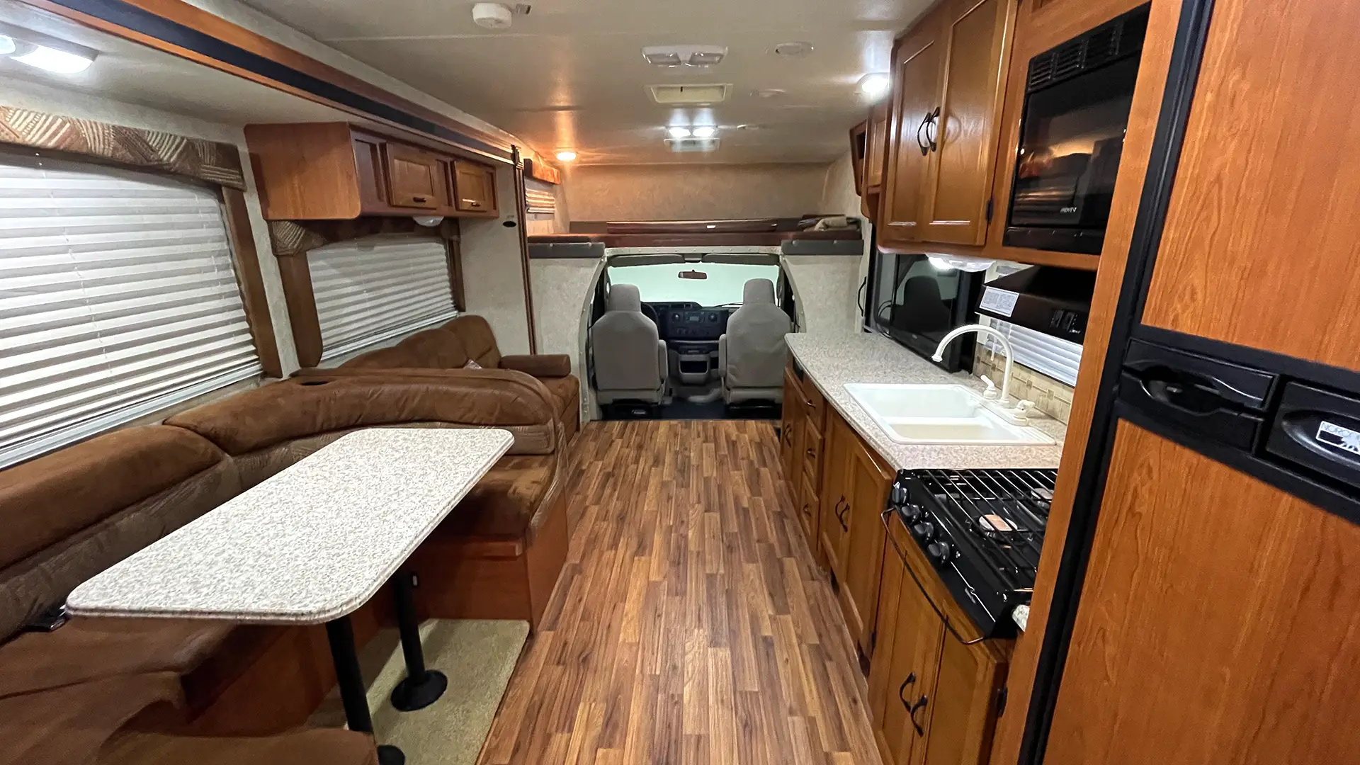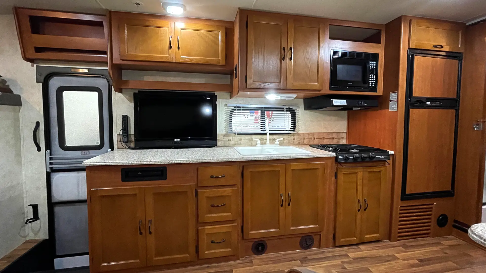 Step inside and you’re greeted by a warm, thoughtfully arranged interior that emphasizes relaxation and togetherness. The spacious living area, complete with a convertible sofa and dinette, creates a welcoming hub where family and friends can gather after a day of exploring. Entertainment is built in, with a 32” LCD TV and media inputs that let you enjoy movies or games on the road, while the residential-style queen bed ensures restful nights that rival the comfort of home.