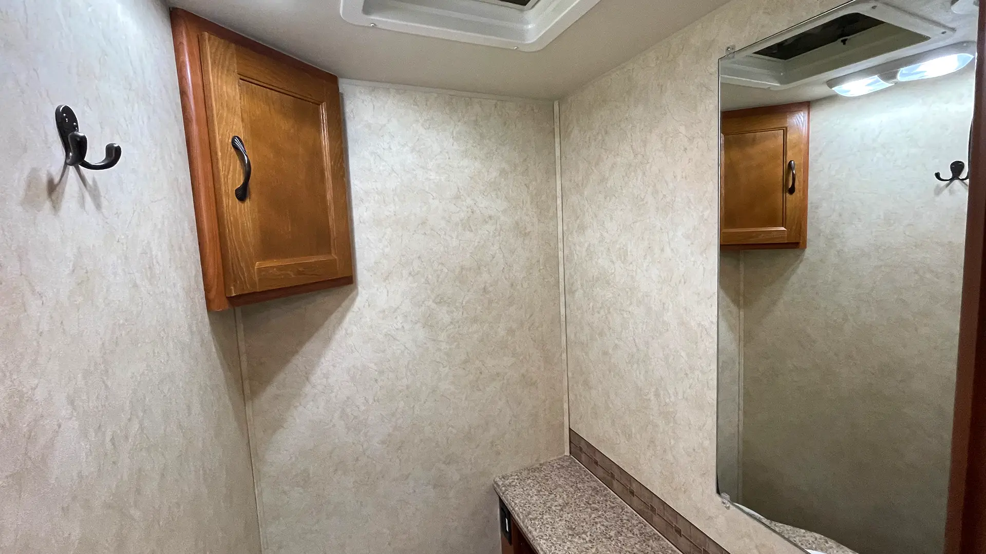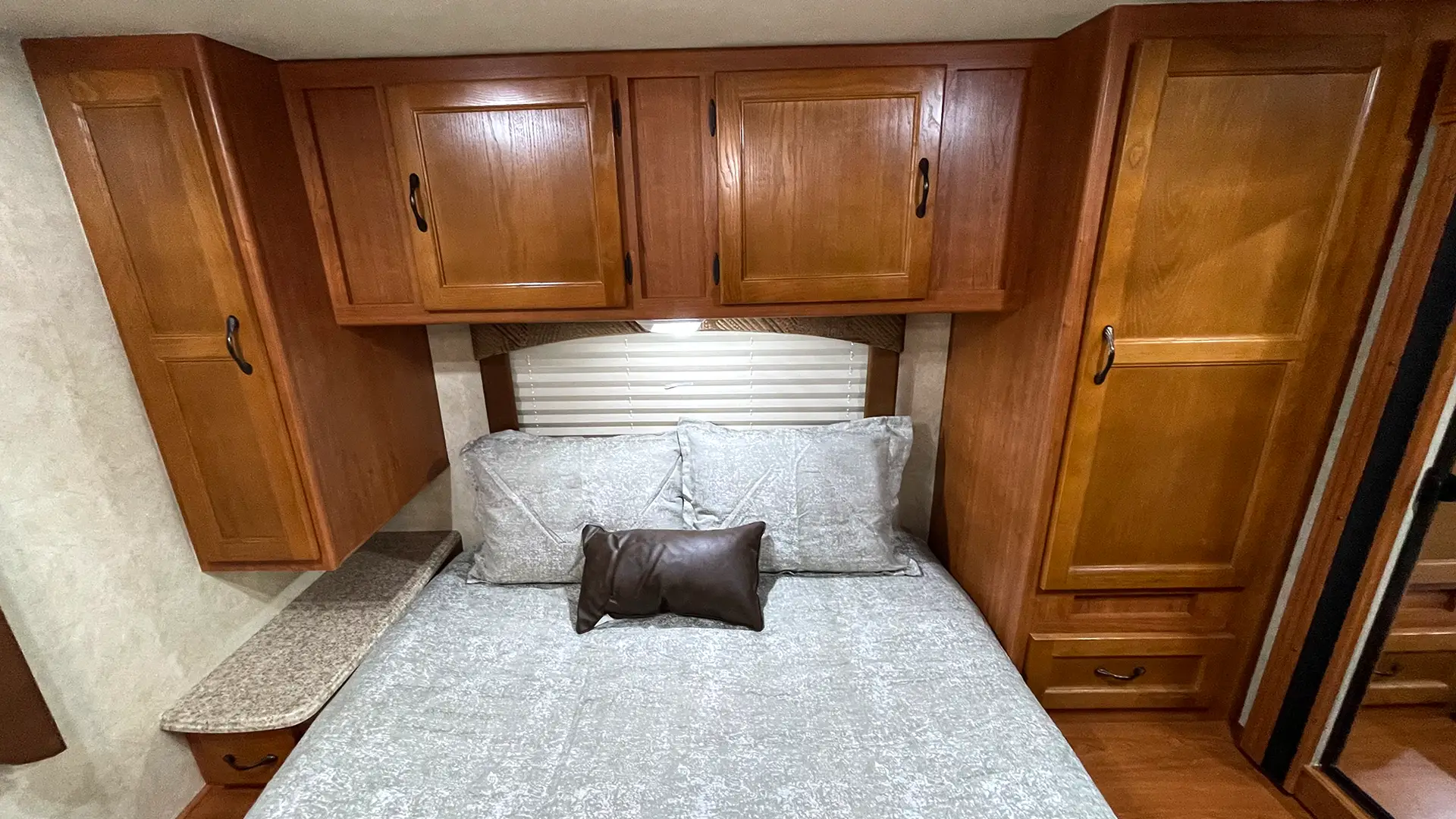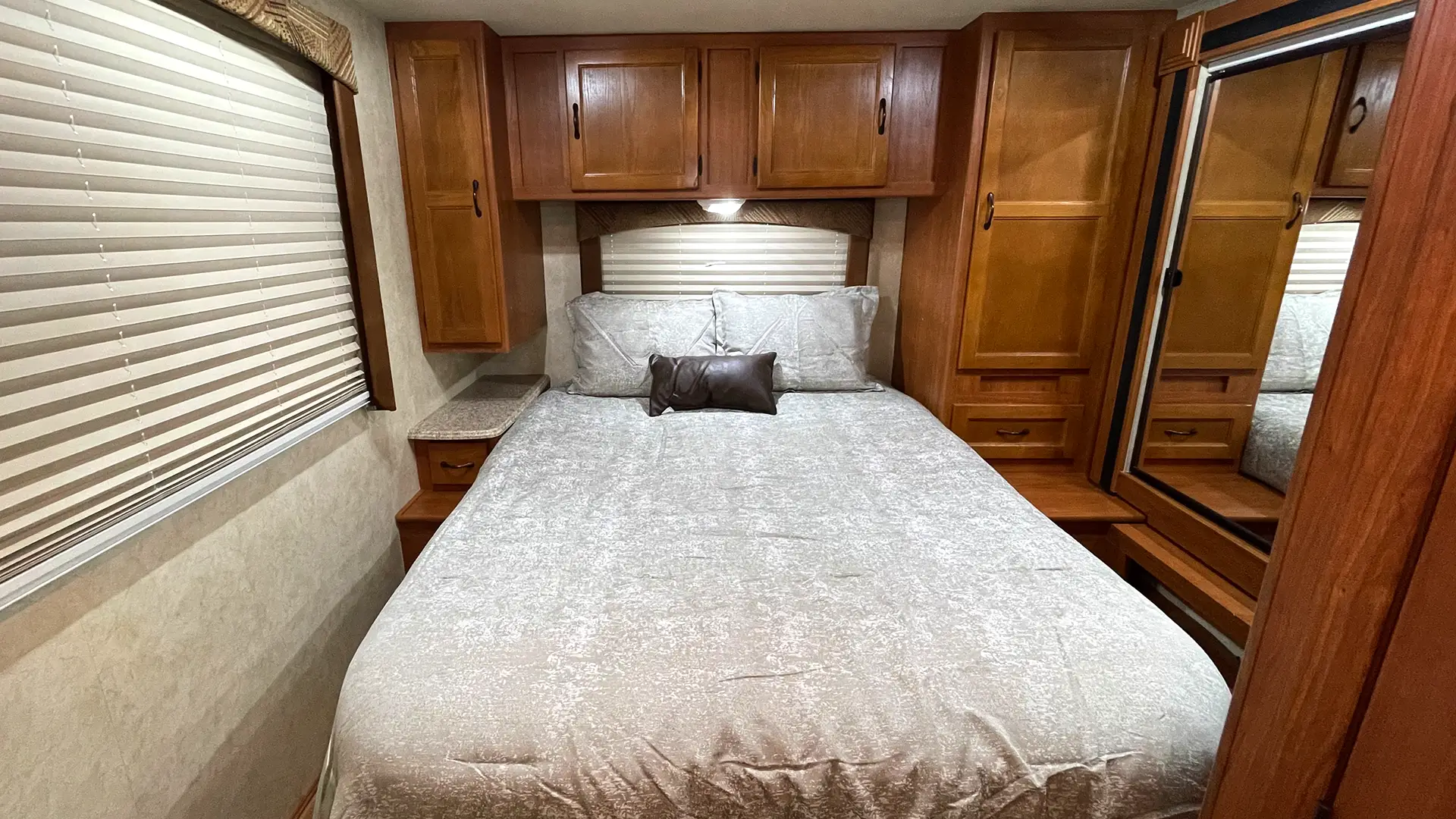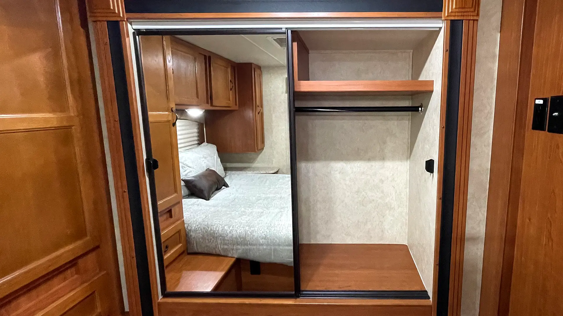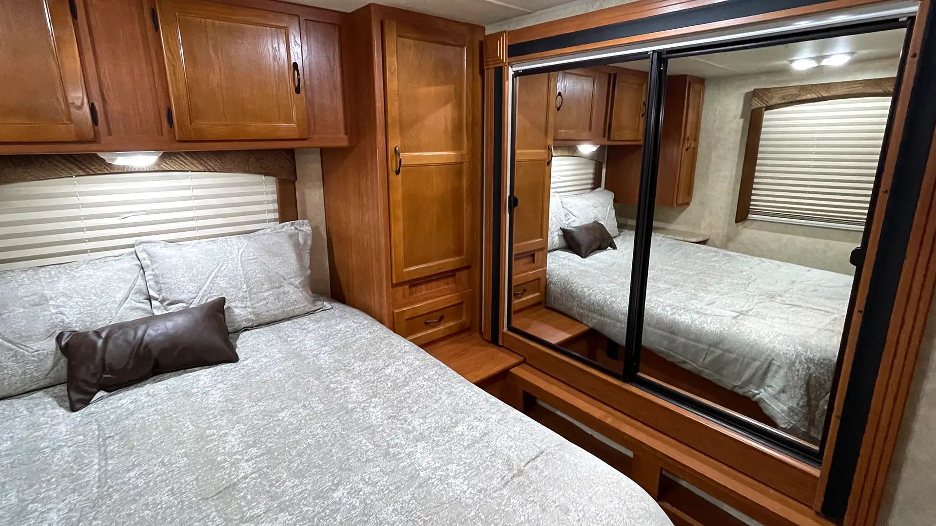 | Bedroom | Rear Queen Bed w/Overhead Cabinet Storage; Wardrobe/Shirt Closet Space; Full Wardrobe Closet Space w/Mirrored Sliding Doors (on Slide-out) |