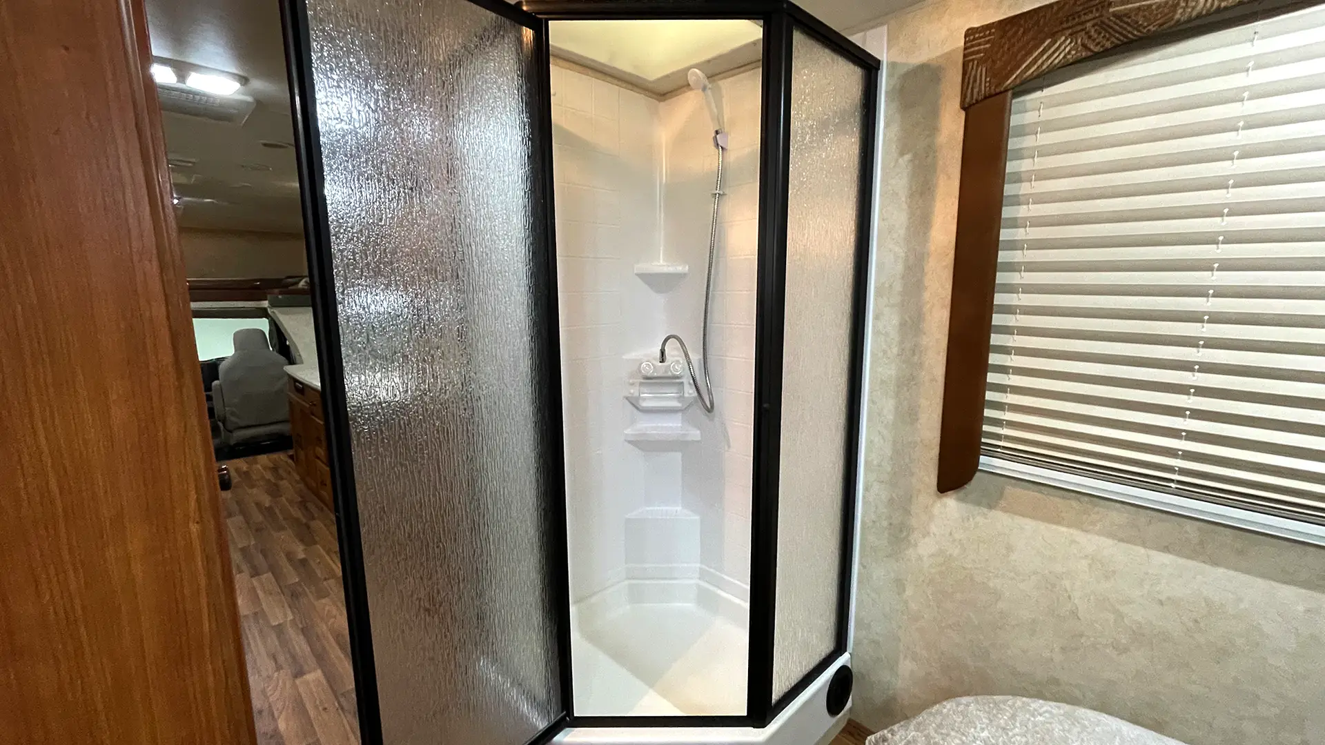 | Bathroom | Foot Pedal Toilet; Corner Medicine Cabinet; Large Vanity Mirrored; Molded Neo-Angle Tub/Shower Surround w/Glass Shower Door and Flexible Hose Extension Shower Head |