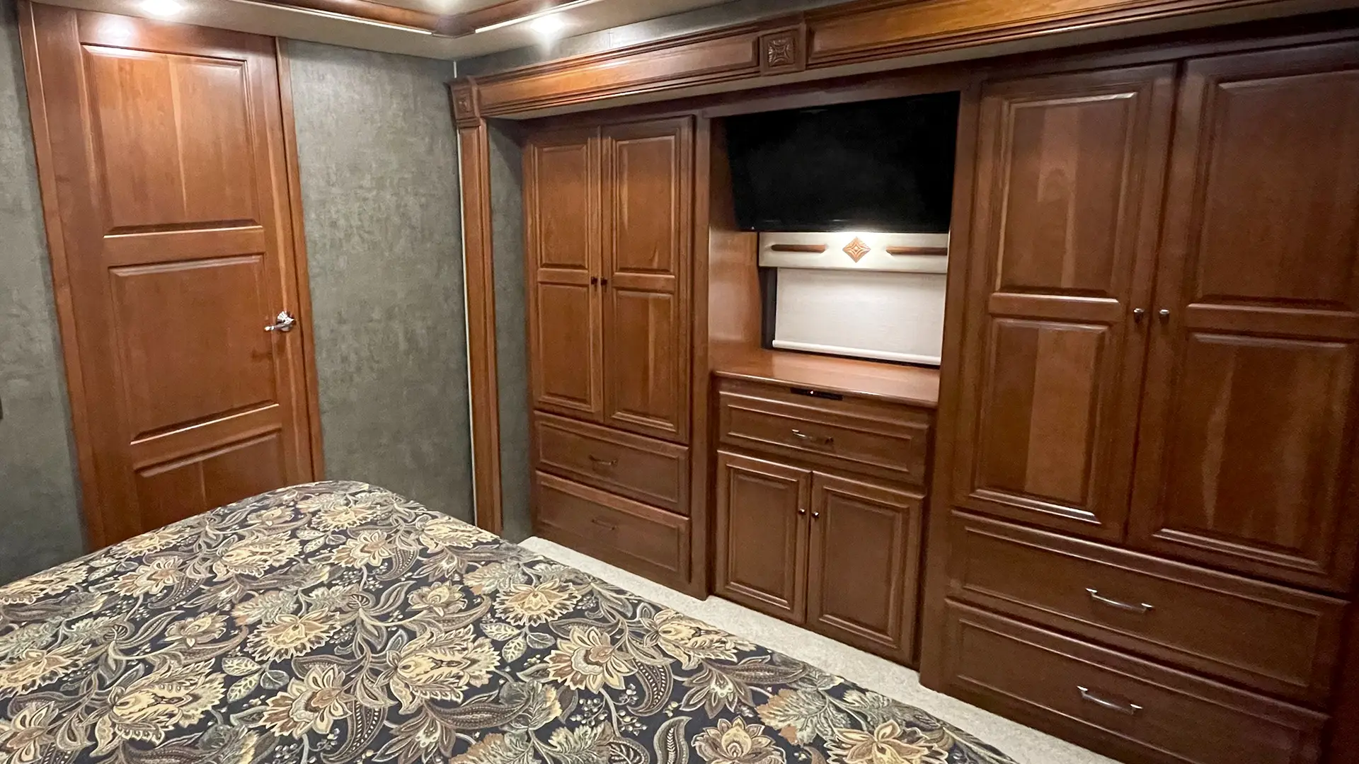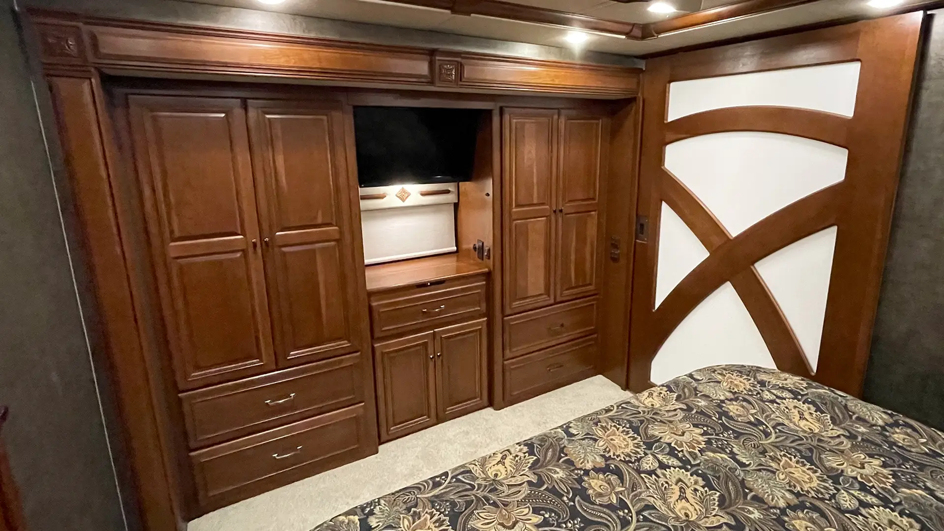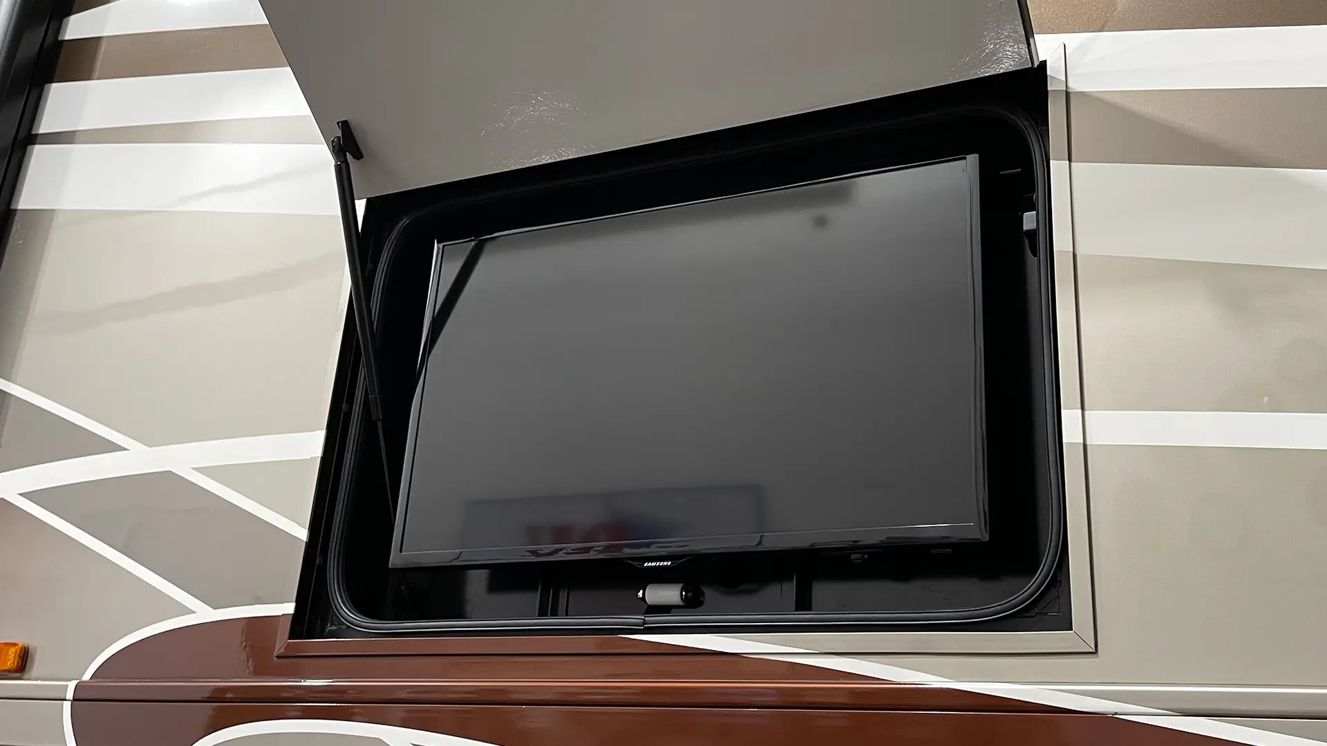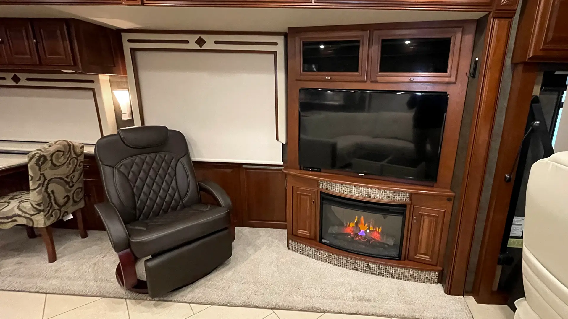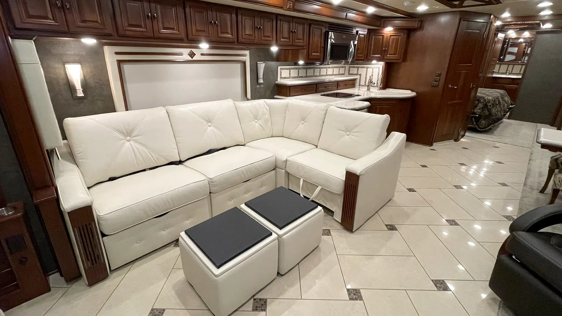Beyond aesthetics, the Ellipse 42QD delivers a driving experience that’s smooth and confident thanks to its Freightliner Maxum chassis and powerful Cummins diesel engine. The coach is all-electric, which means quieter operation and fewer maintenance concerns. Whether parked lakeside or cruising through mountain passes, the integrated technology, like premium sound systems, multiple flat-screen TVs, and automatic levelling, ensures every moment is as relaxing as it is refined. It’s not just about getting from point A to B; it’s about savouring the journey in style.