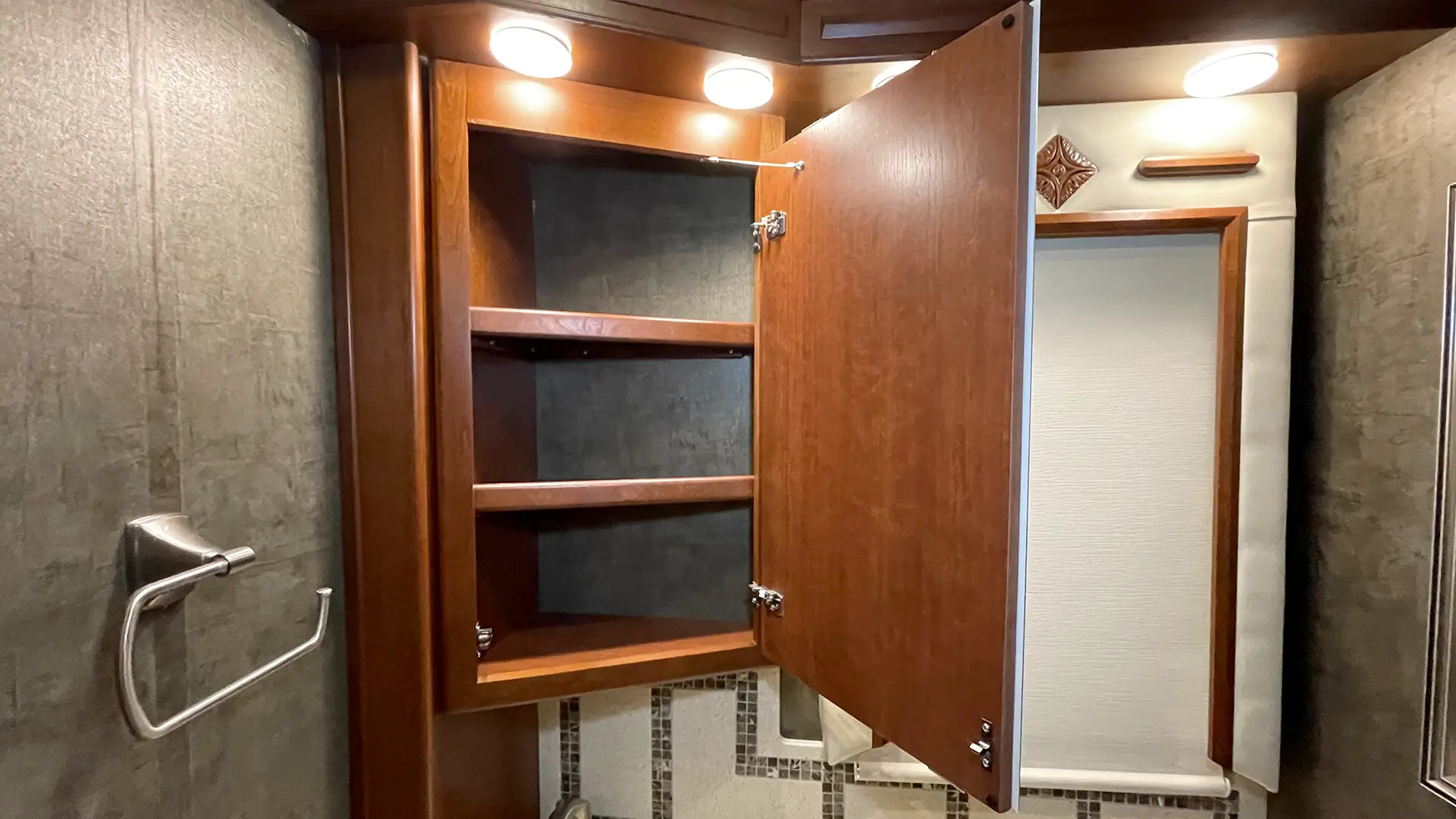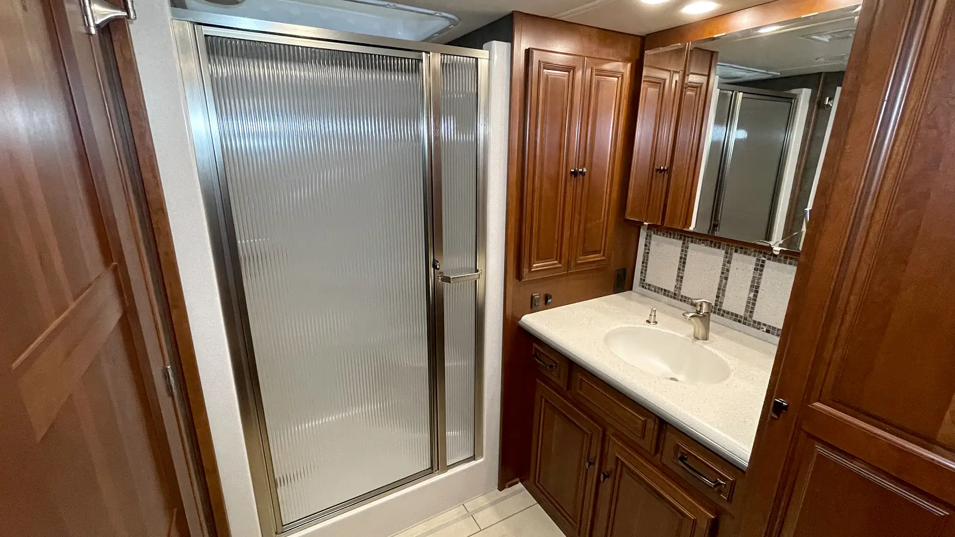 Finishes | Heated Flooring; LED Ceiling Lights w/Dimming Feature; Soft Vinyl Ceiling; Honey Cherry Cabinetry |