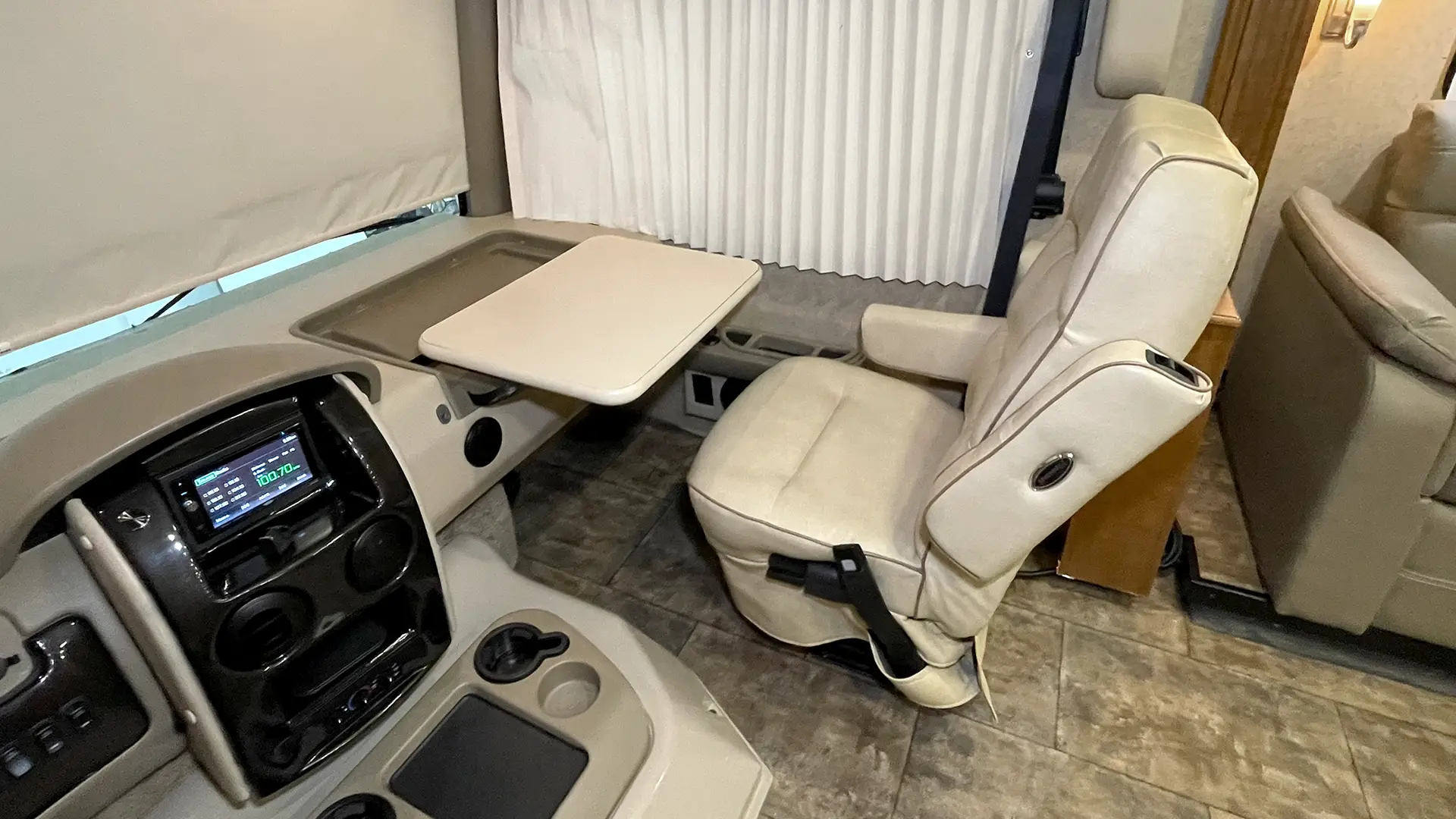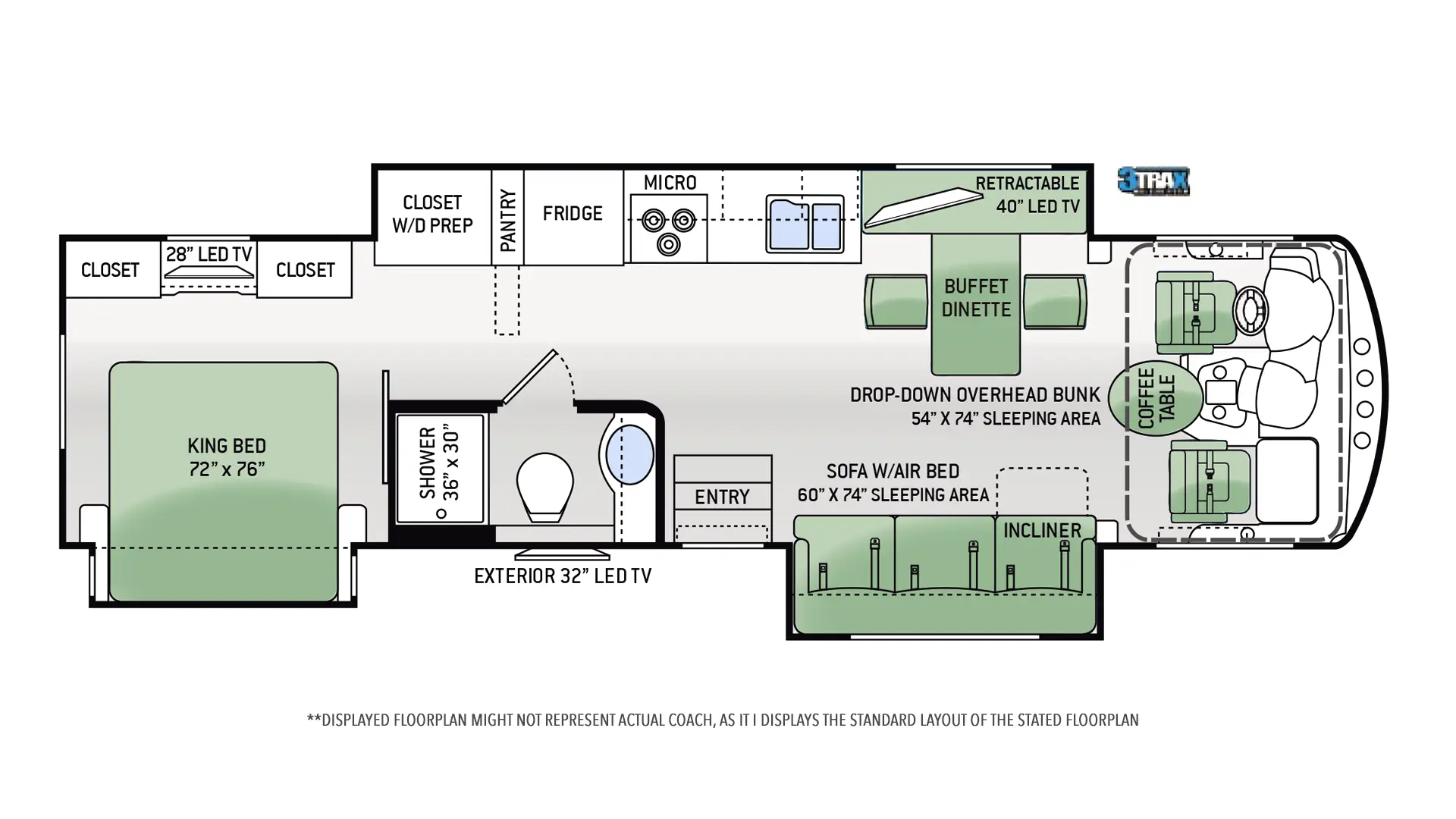 | Entertainment | Entertainment Centre w/DVD Player and Sound Bar; Bluetooth Coach Radio System w/Exterior Speakers; Power Charging Center for Electronics |