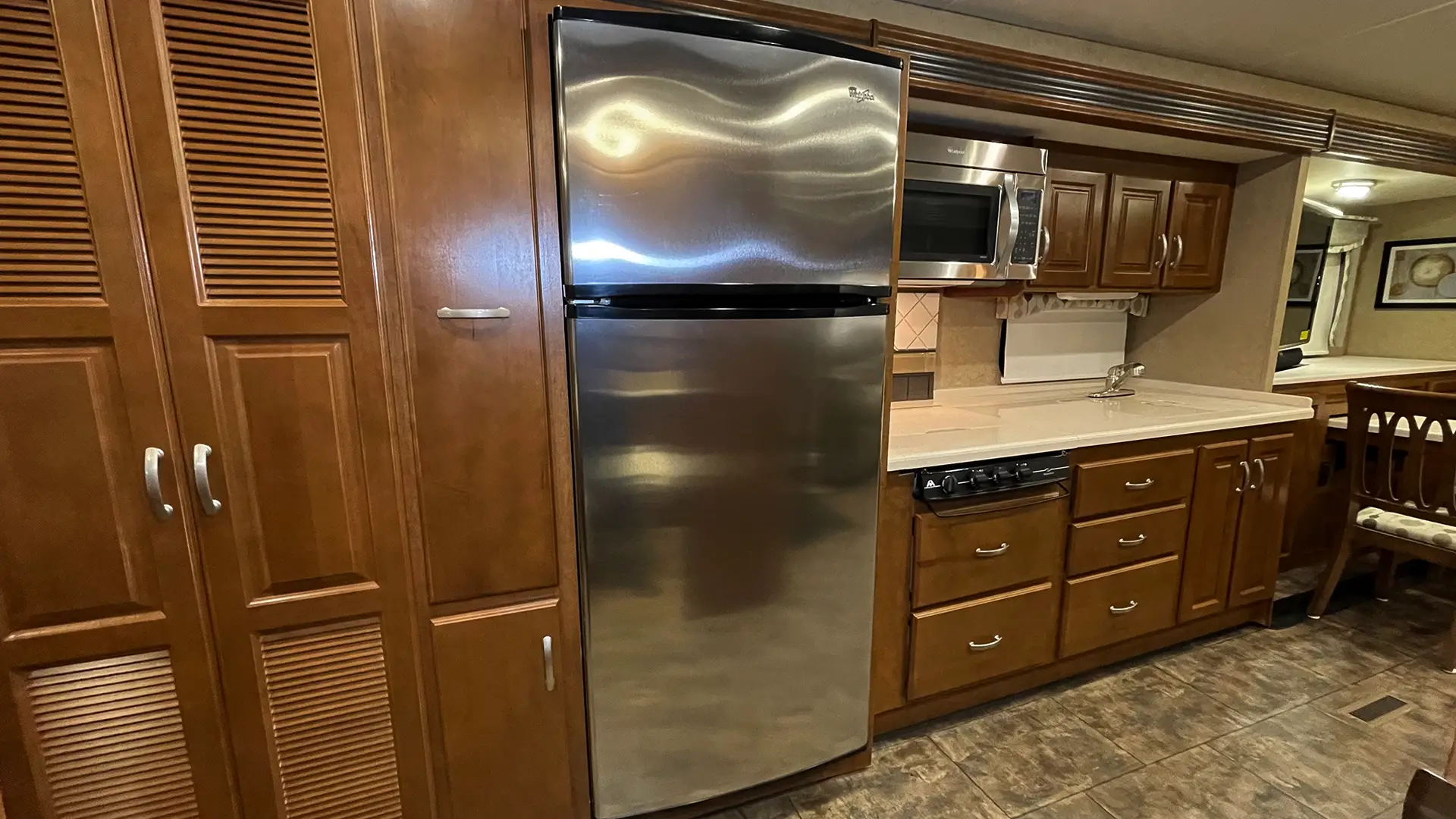When you step inside, you’re greeted by a warm, inviting interior that blends luxury with livability. The triple-slide layout opens up the space dramatically, creating distinct zones for lounging, dining, and sleeping. Rich wood cabinetry, a freestanding dinette, and plush seating evoke the ambiance of a high-end condo, while the king-size bed and drop-down overhead bunk ensure restful nights for couples and guests alike. The residential refrigerator and full kitchen setup make meal prep feel effortless, whether you are parked lakeside or cruising through the Rockies. With panoramic windows and a 40″ living room TV, the motorhome invites you to relax and take in the scenery, indoors or out.