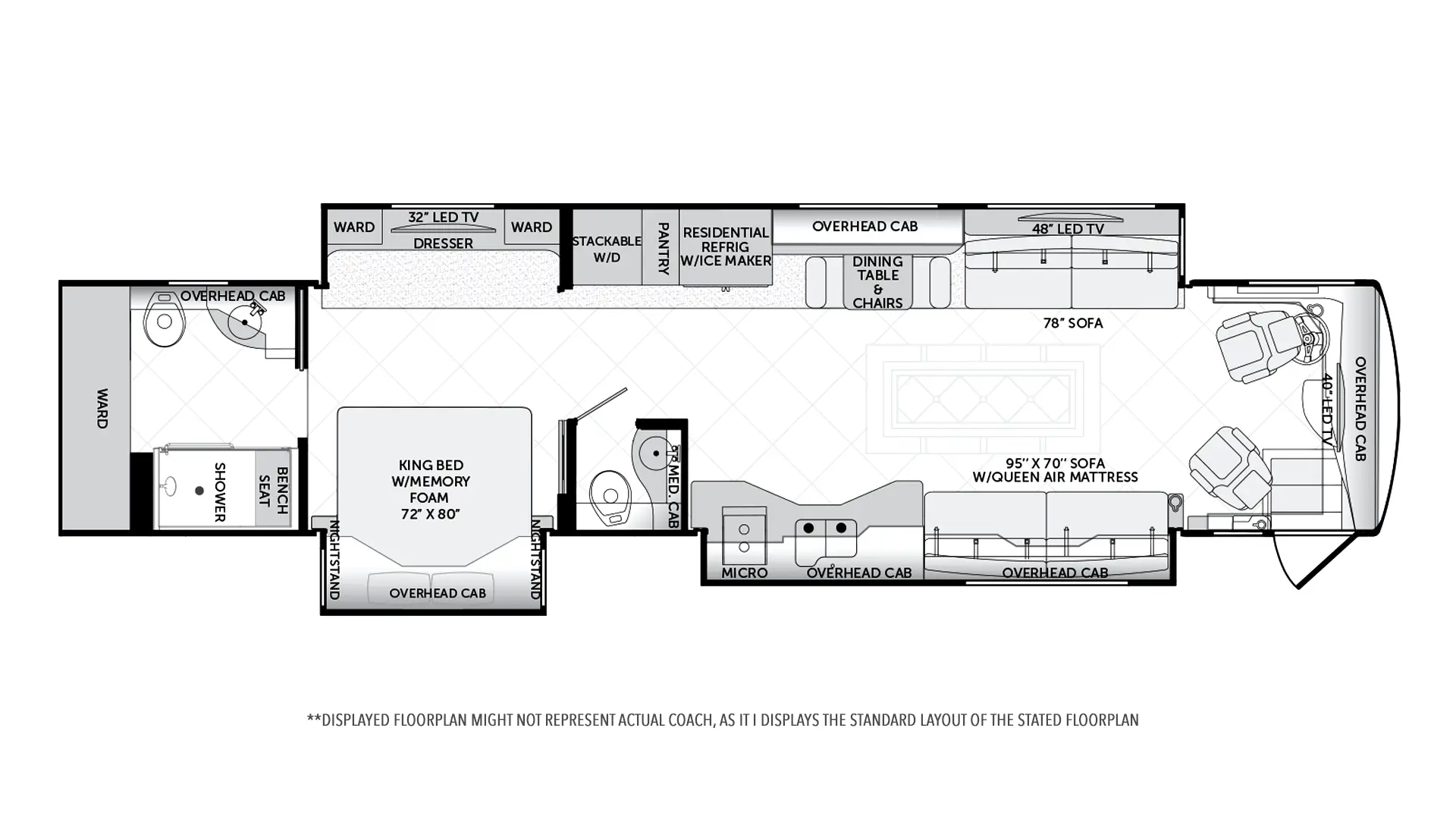 | Televisions | 42” Exterior LED; 42” Overhead LED; 48” LED TV Living Area; 32” LED Bedroom |