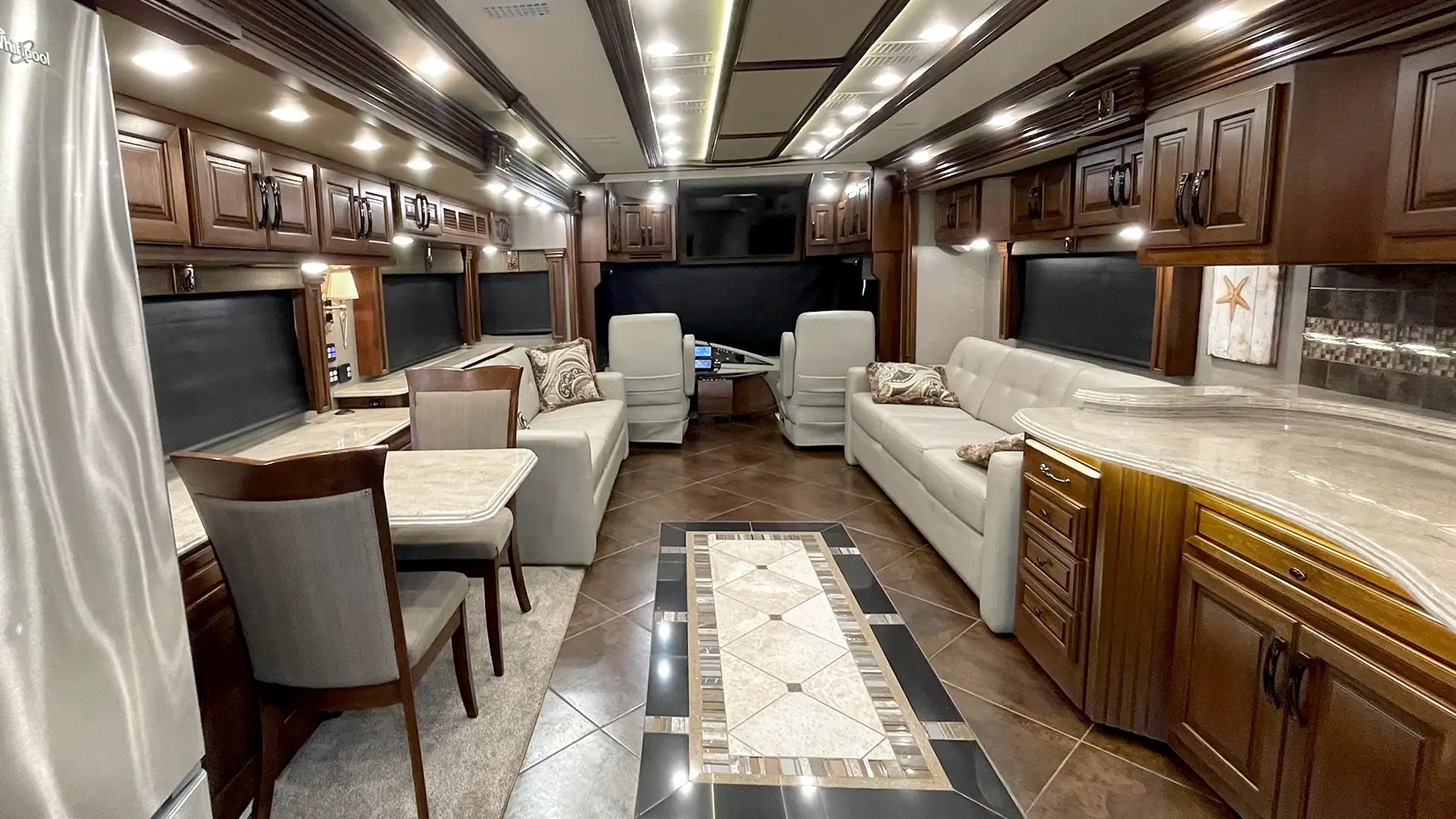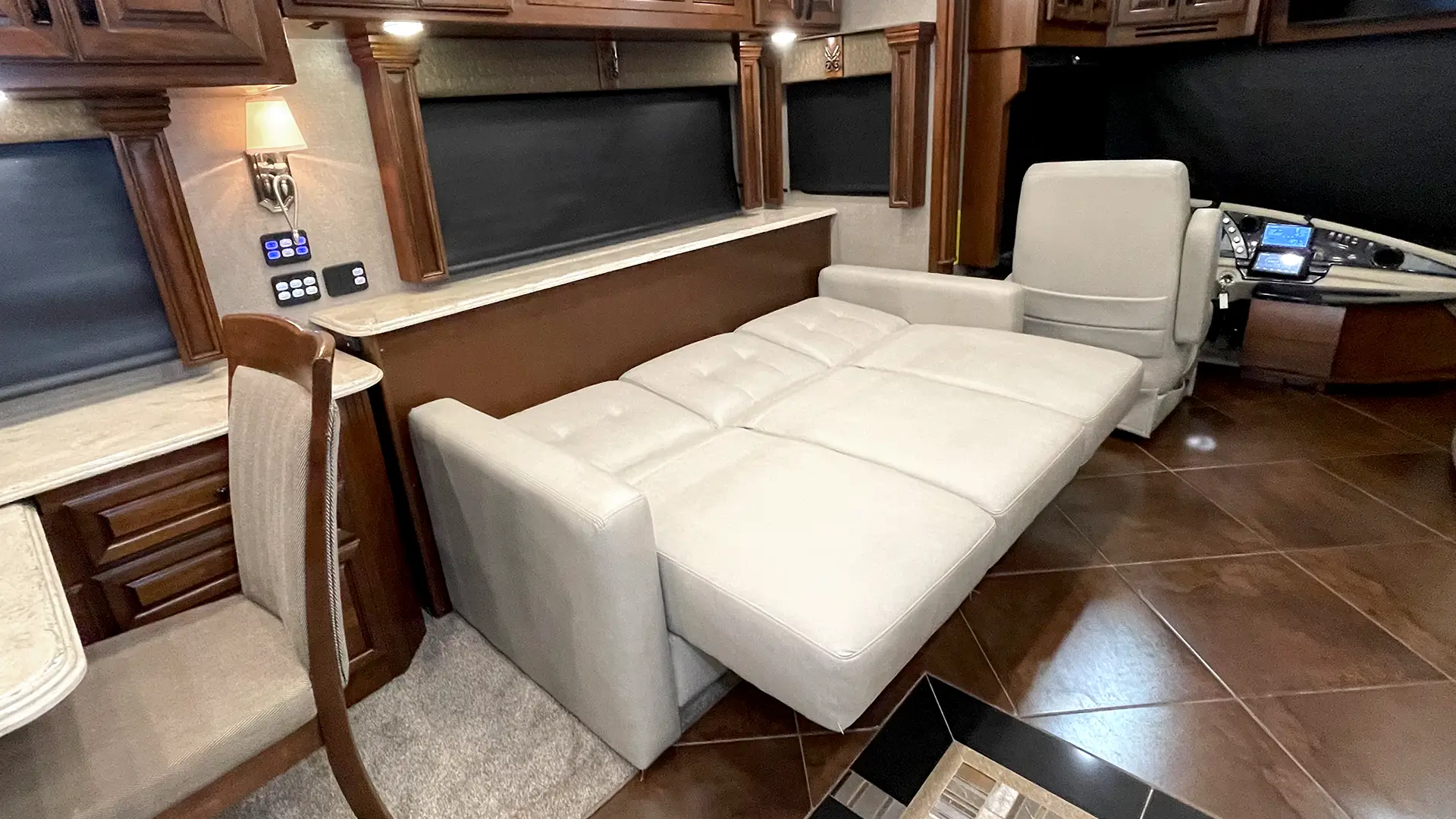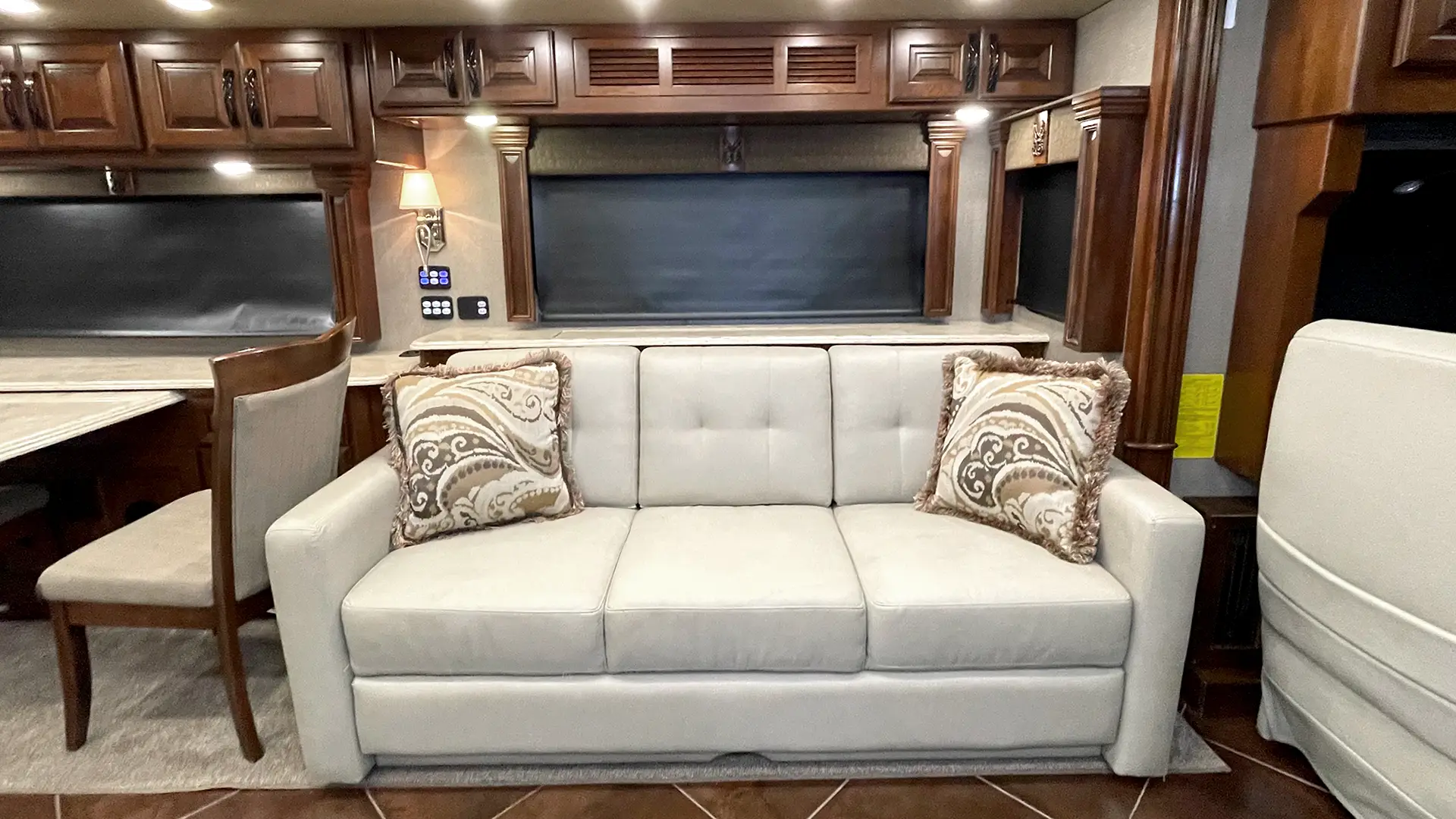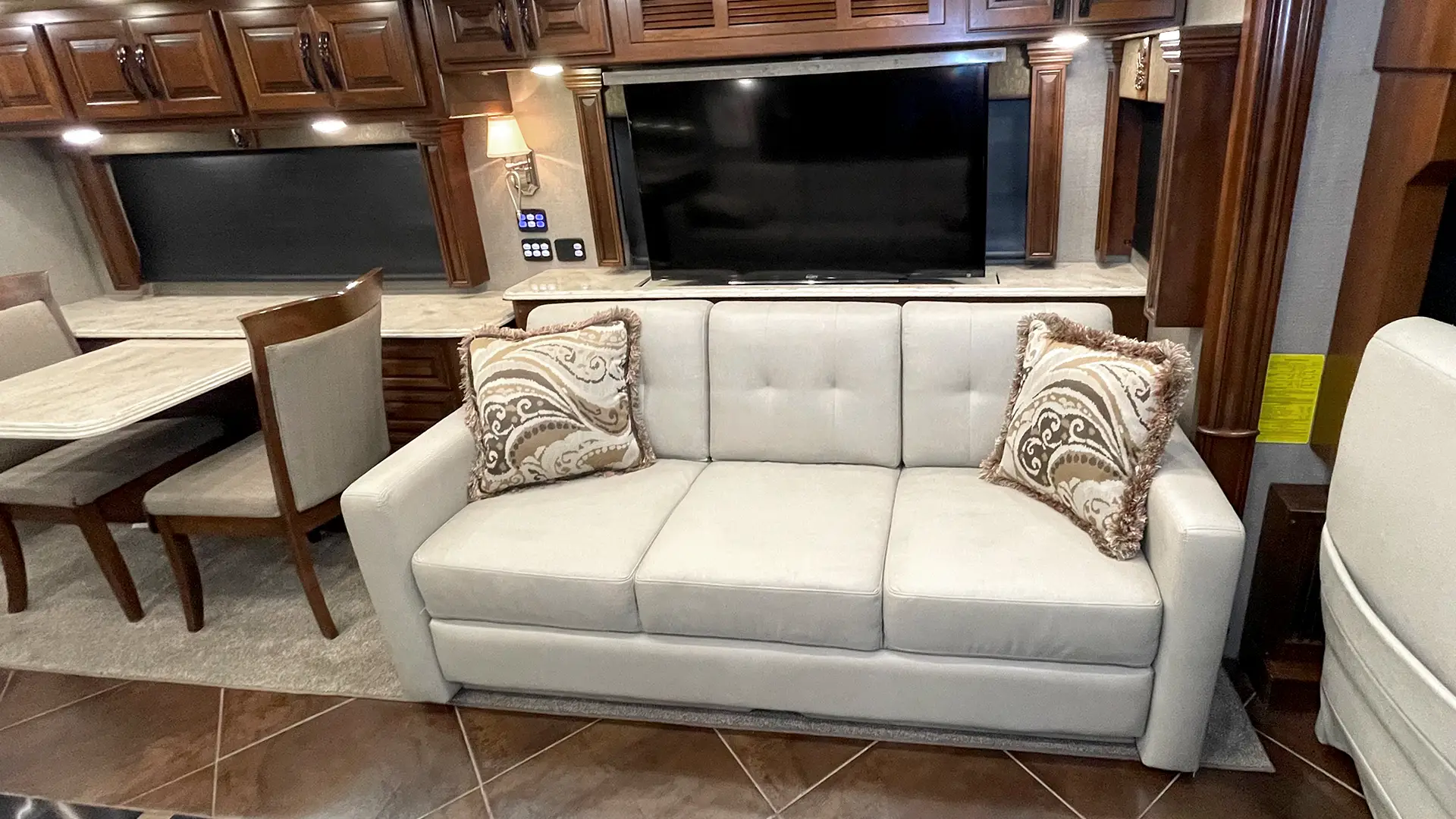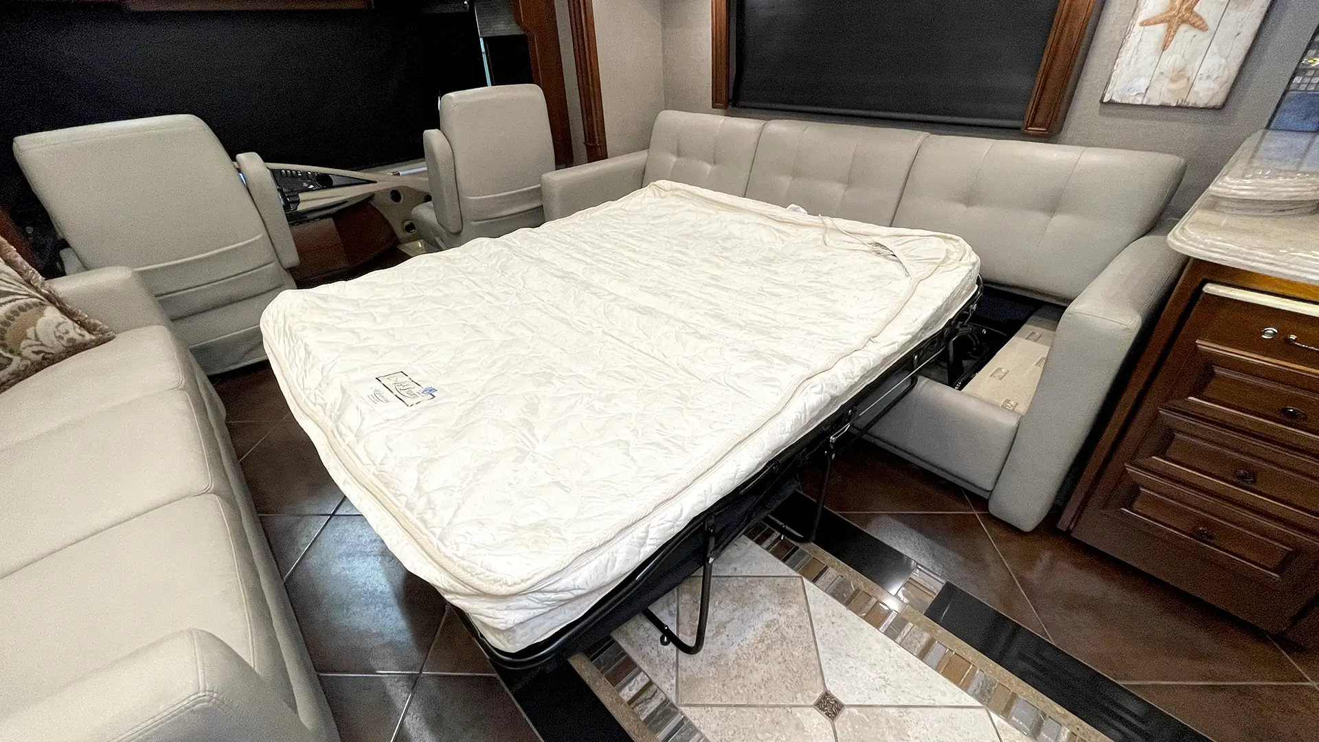 | Furniture | Polished Solid-Surface Dinette Table w/Slide-Out Extension; Villa UltraLeather Sofa Bed w/Air Mattress; Villa UltraLeather Jackknife Sofa |