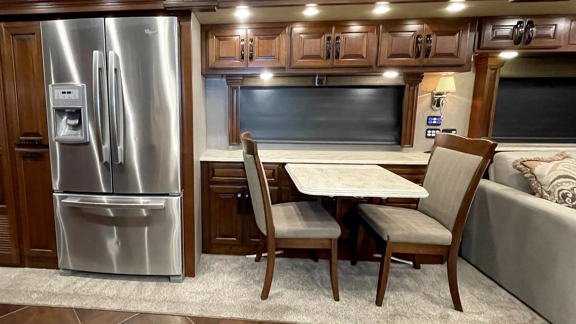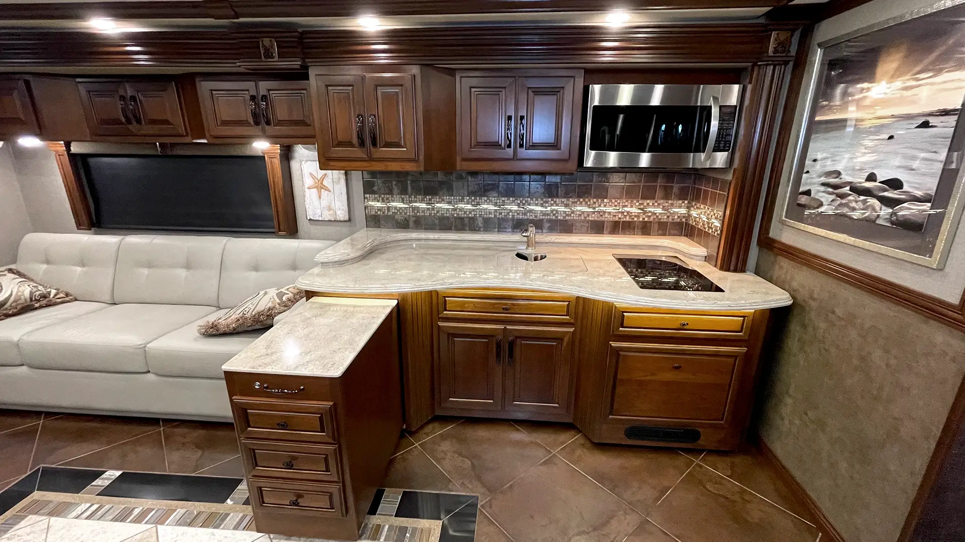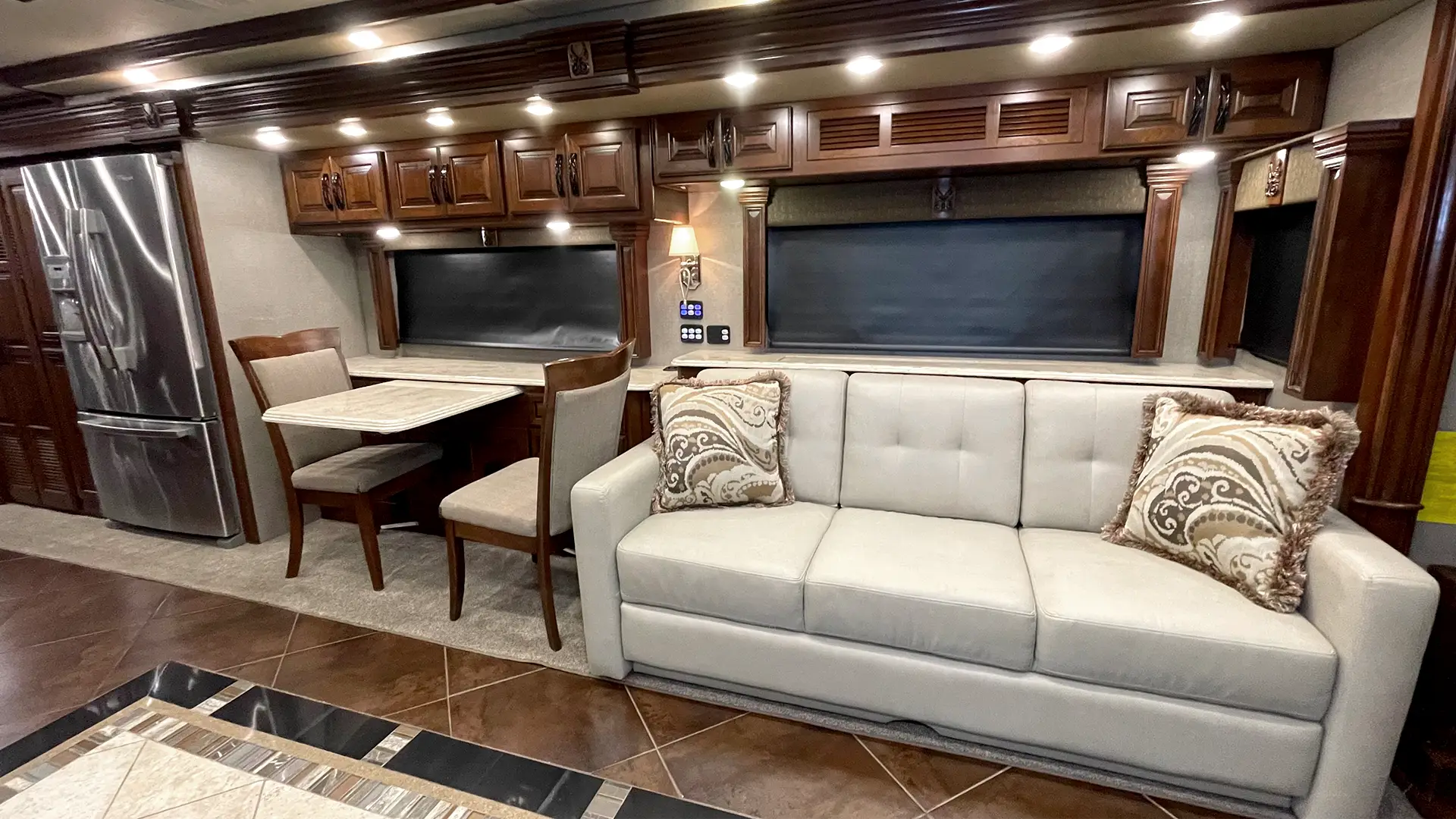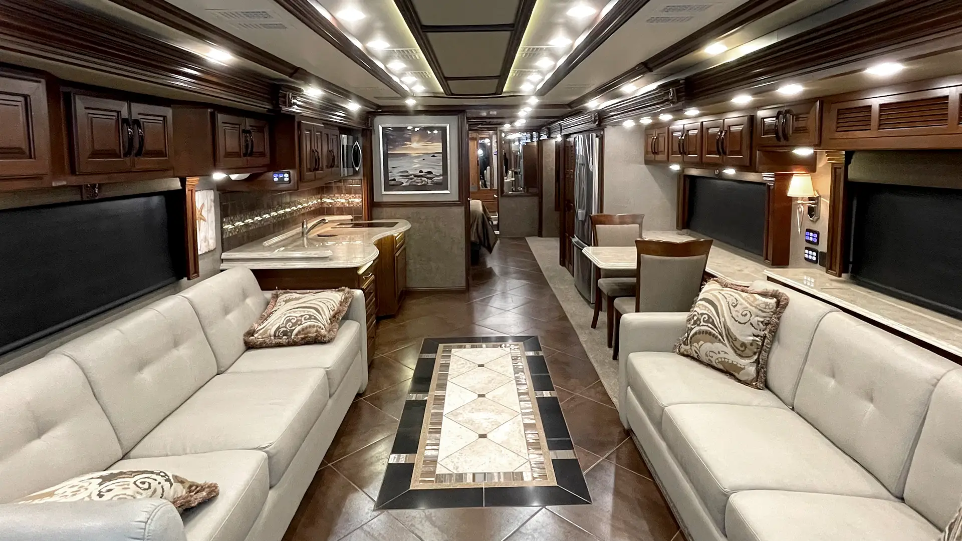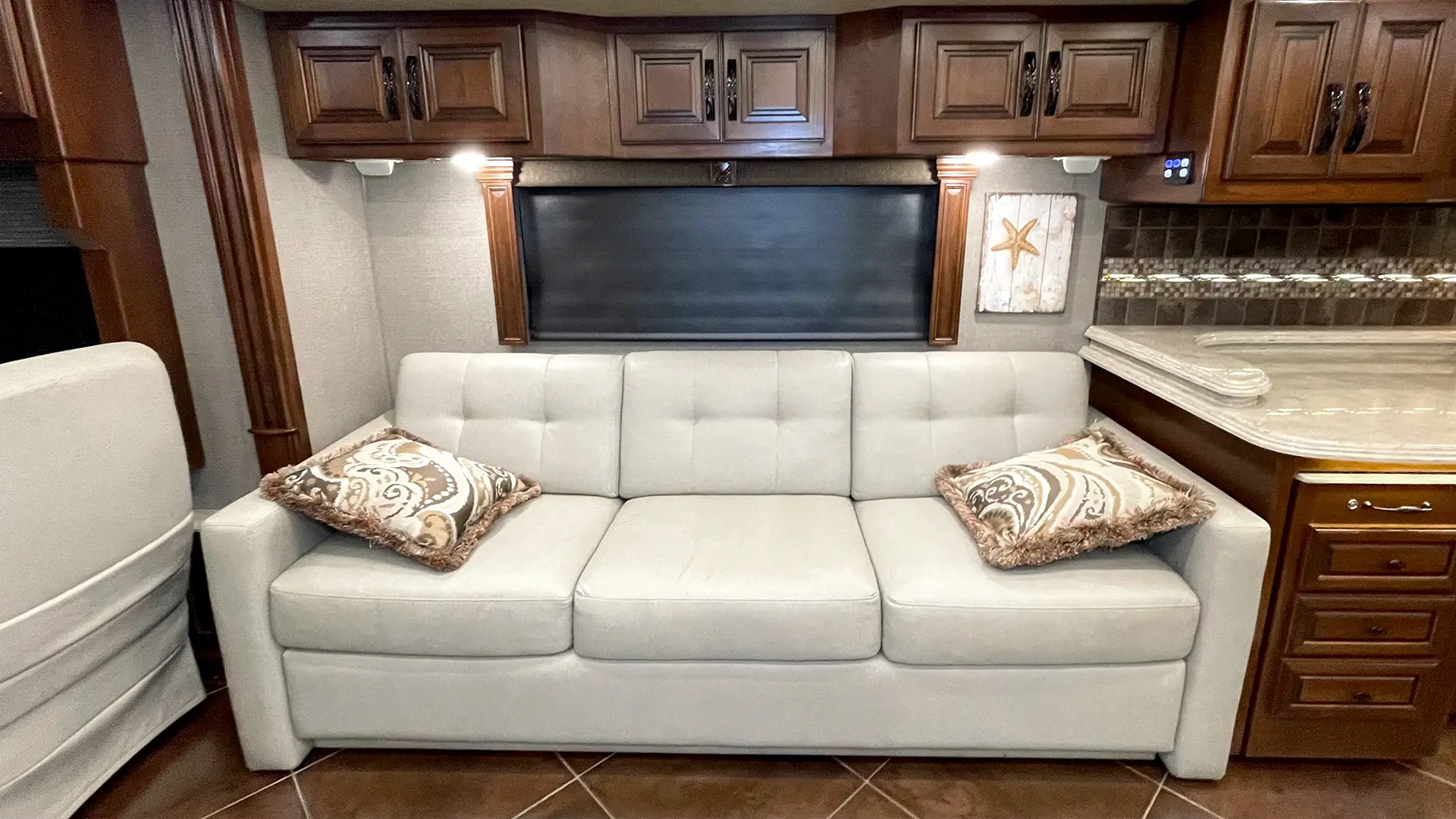 | Furniture | Polished Solid-Surface Dinette Table w/Slide-Out Extension; Villa UltraLeather Sofa Bed w/Air Mattress; Villa UltraLeather Jackknife Sofa |