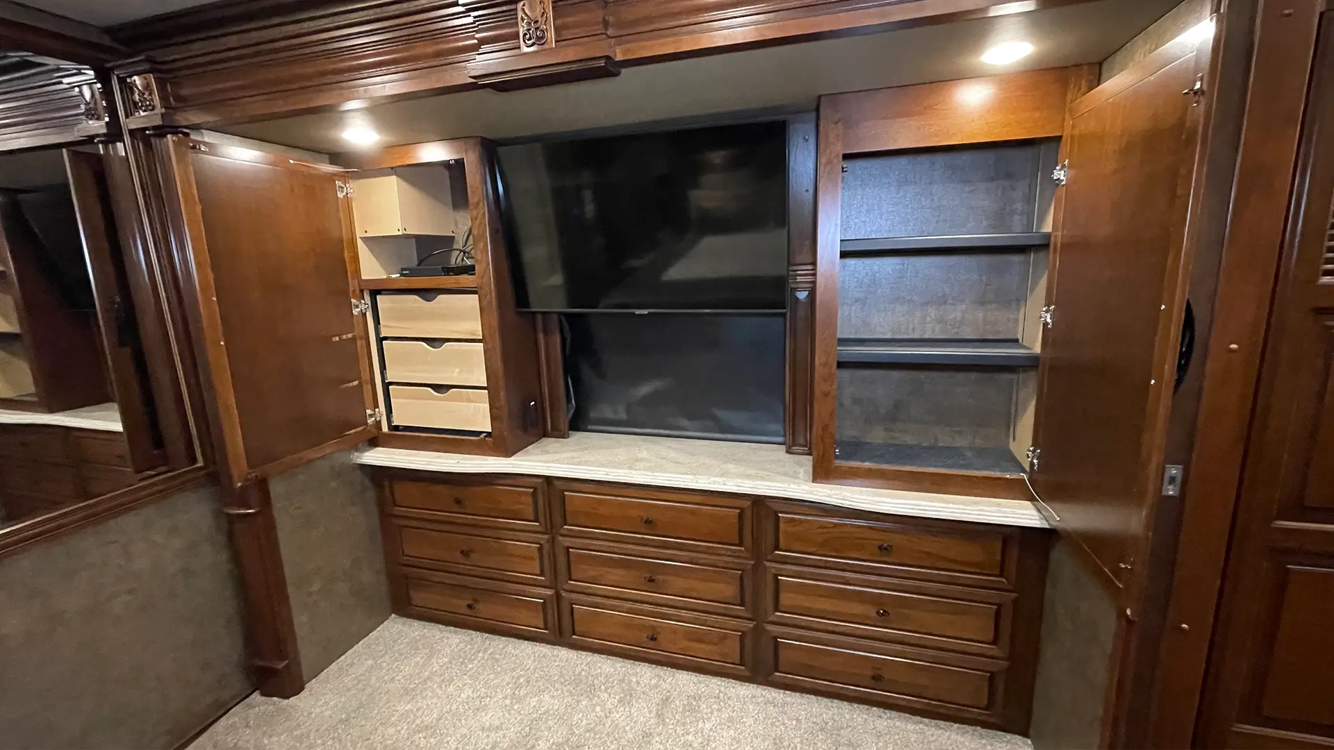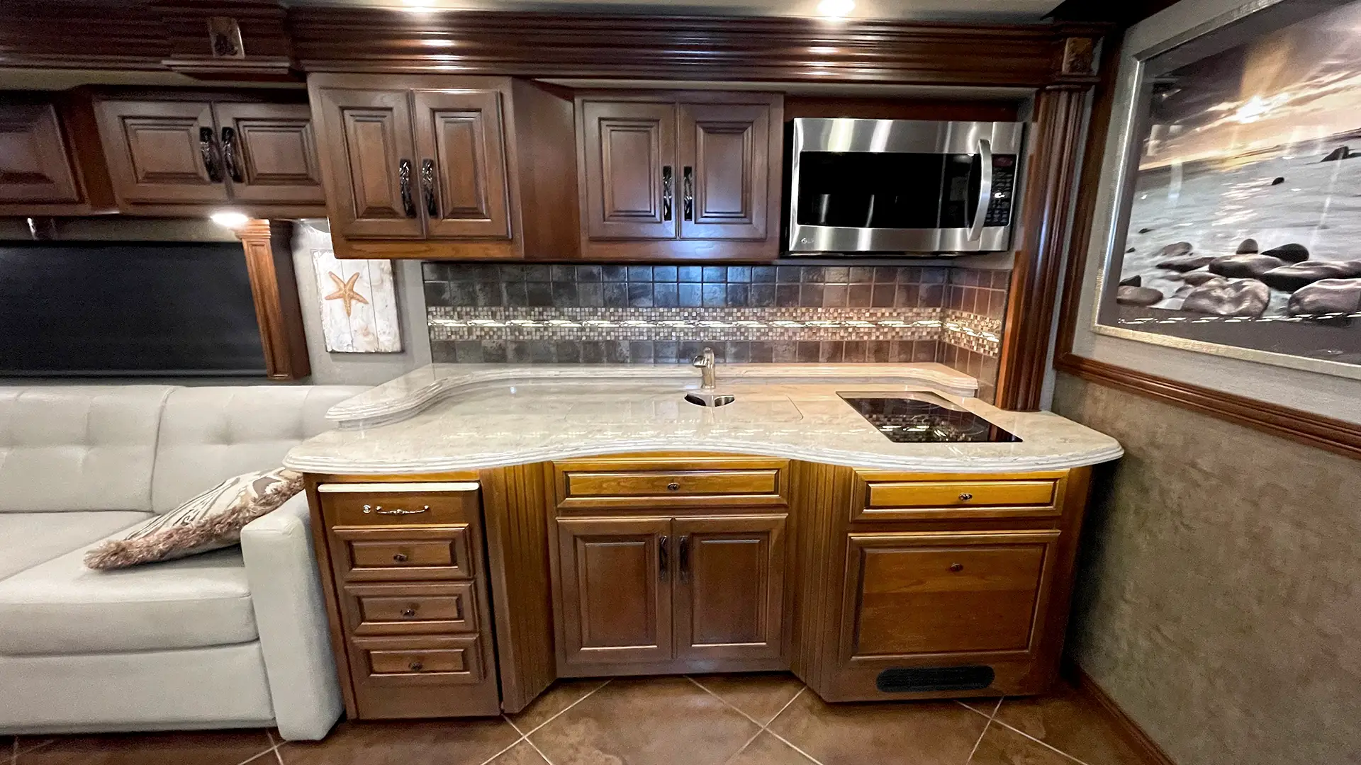 | Finishes | Full Tile Flooring w/Decorative Inset; LED Ceiling & Task Lighting; Lined Cabinet Interiors; Premium Hardwood Cabinet Doors; Polished Solid Surface Countertops |
