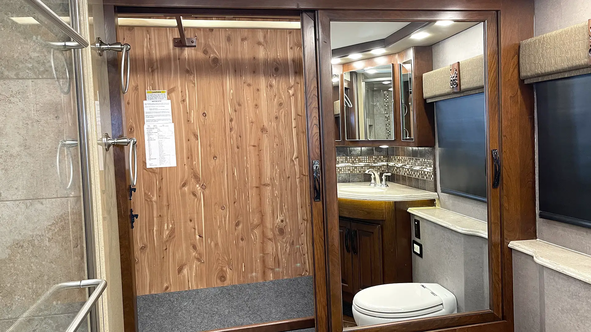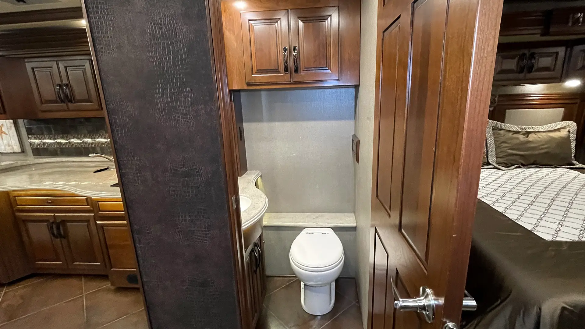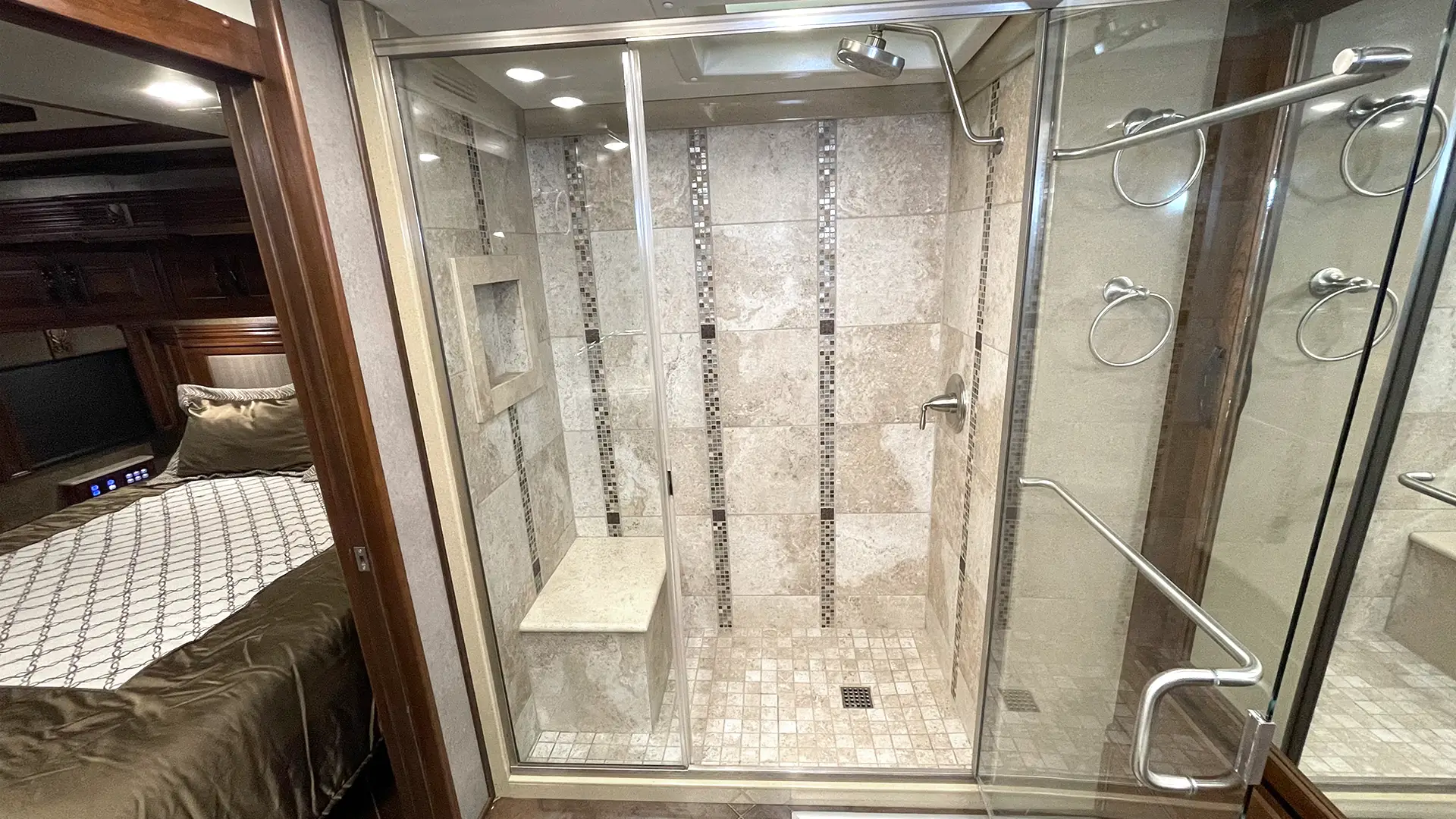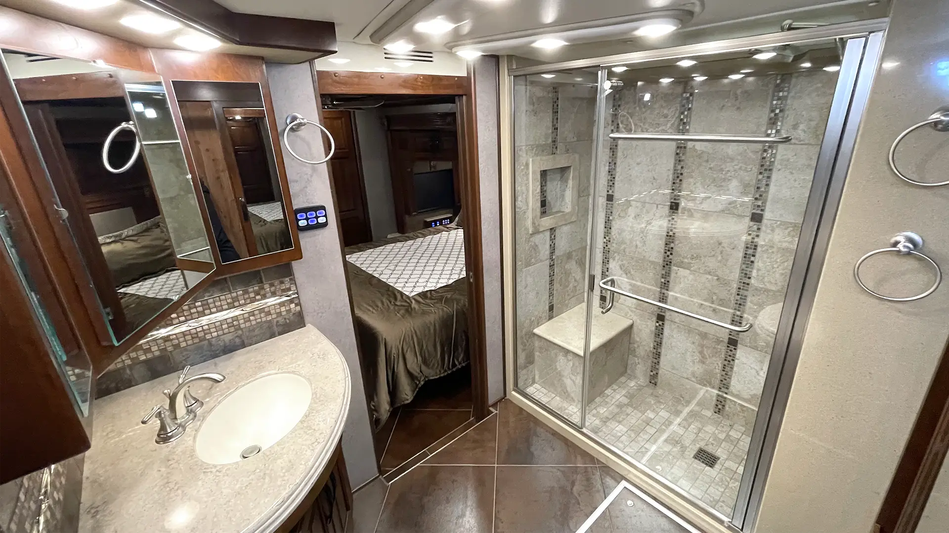 | Ensuite Bathroom | Silence Plus 2-Button Porcelain Vacuum Toilet; Mirrored Front Medicine Cabinet; Tile Shower w/Bench Seating, Molded Shower Caddy and Obscure-Style Glass Door; Full-Length Rear Wardrobe Closet w/Mirrored Sliding Doors |