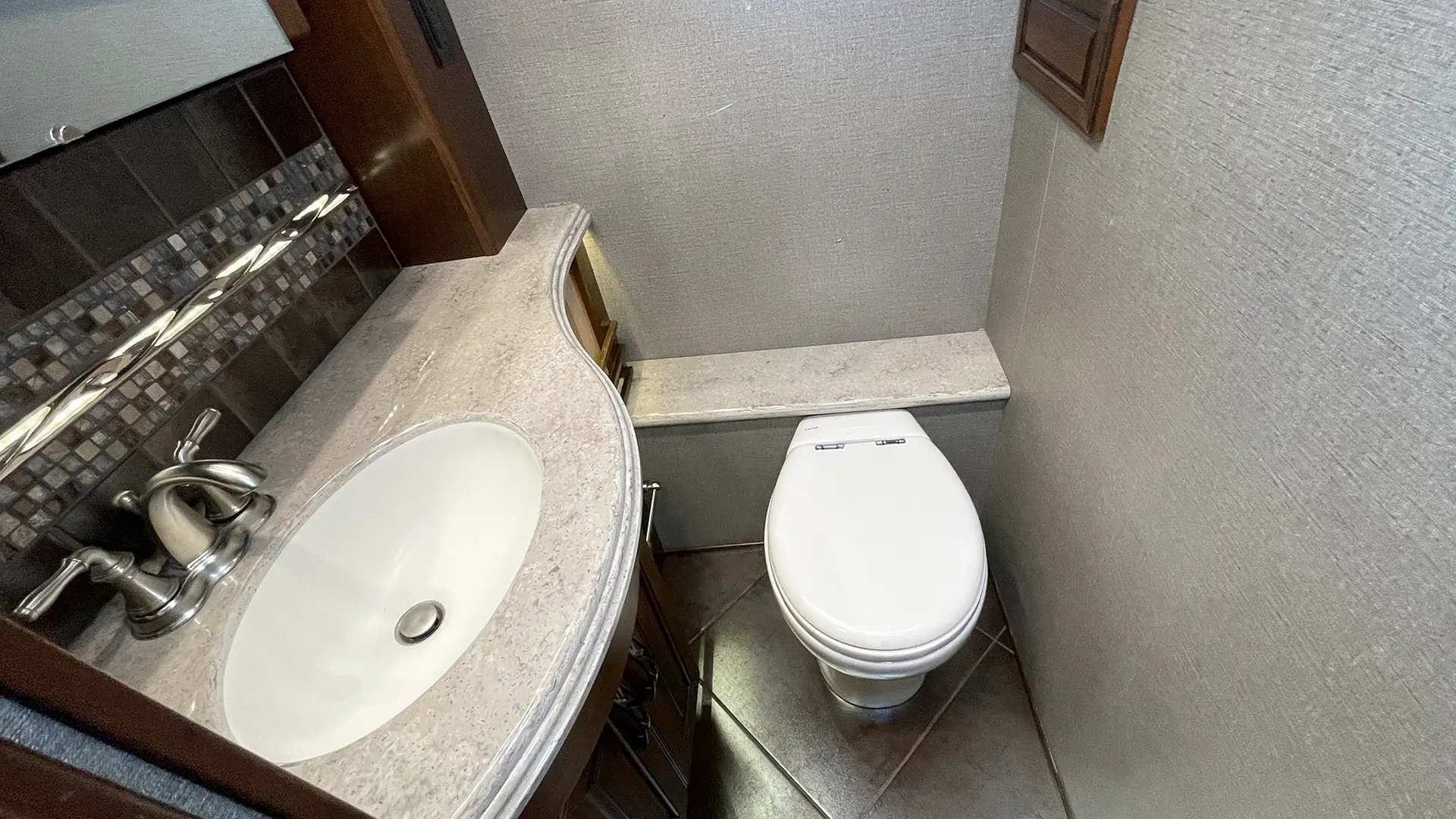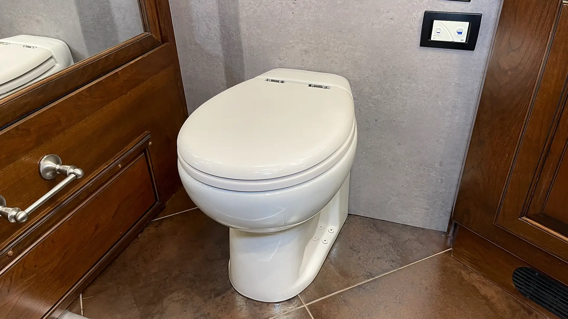 | Half Bath | Silence Plus 2-Button Porcelain Vacuum Toilet; Mirrored-Front Medicine Cabinet |